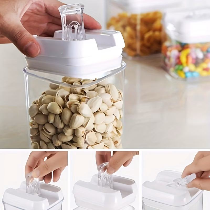 This container for storing food is constructed from plastic that is free from BPA and safe for food, with a modular design for efficient organization on kitchen counters and in pantries. Each container is equipped with a secure locking mechanism that ensures a tight seal, keeping the contents dry and fresh. By pressing down on the lid, the silicone seal inside expands to create an airtight closure, making it an ideal solution for preserving ingredients and foo