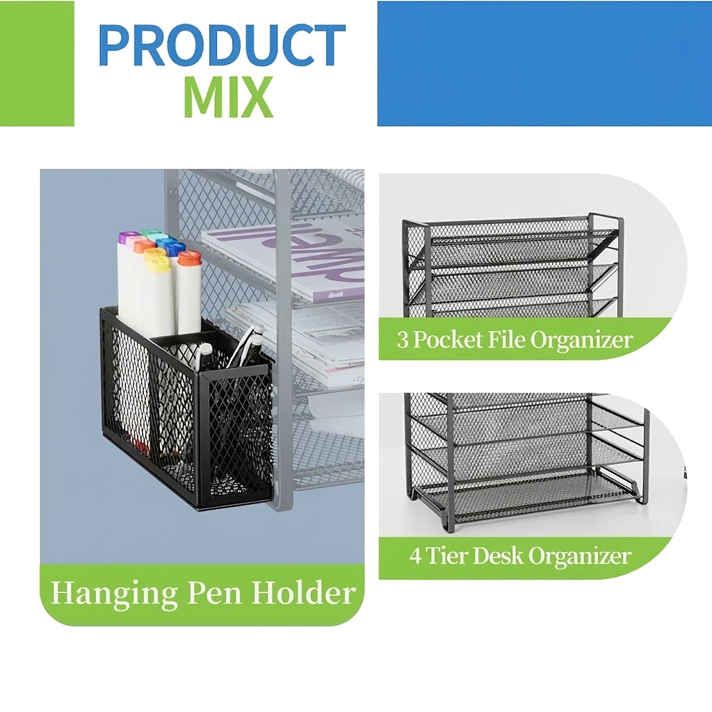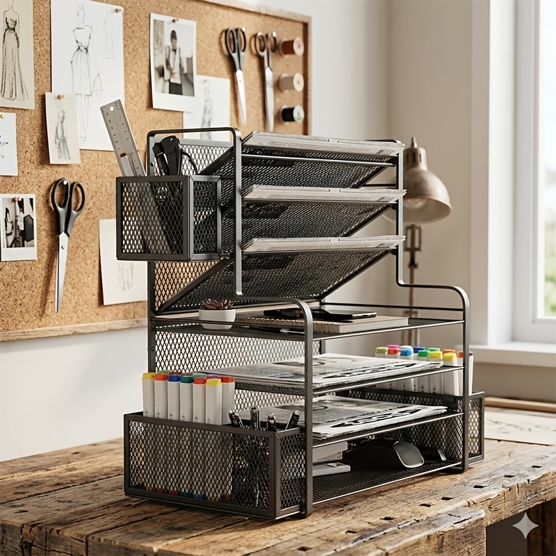 [Layered Storage Solution] 7-tier integrated design featuring slanted slots and flat shelves, perfect for organizing A4 documents, folders, and notebooks.[Desk Space Maximizer] Efficiently utilizes vertical space to declutter your workspace, keeping all your essentials within easy reach.[Convenient Side Holders] Includes built-in hanging baskets and compartments specifically designed for pens, markers, and small office tools.[Solid Mesh Construction] Built with high-density metal mesh and a reinforced frame for stable support and daily desktop use.[User-Friendly Design] Crafted with smooth rounded corners for a sleek look and a stable base to help prevent desktop scratches.Material: Metal Mesh with Classic Black Finish Color: Matte Black