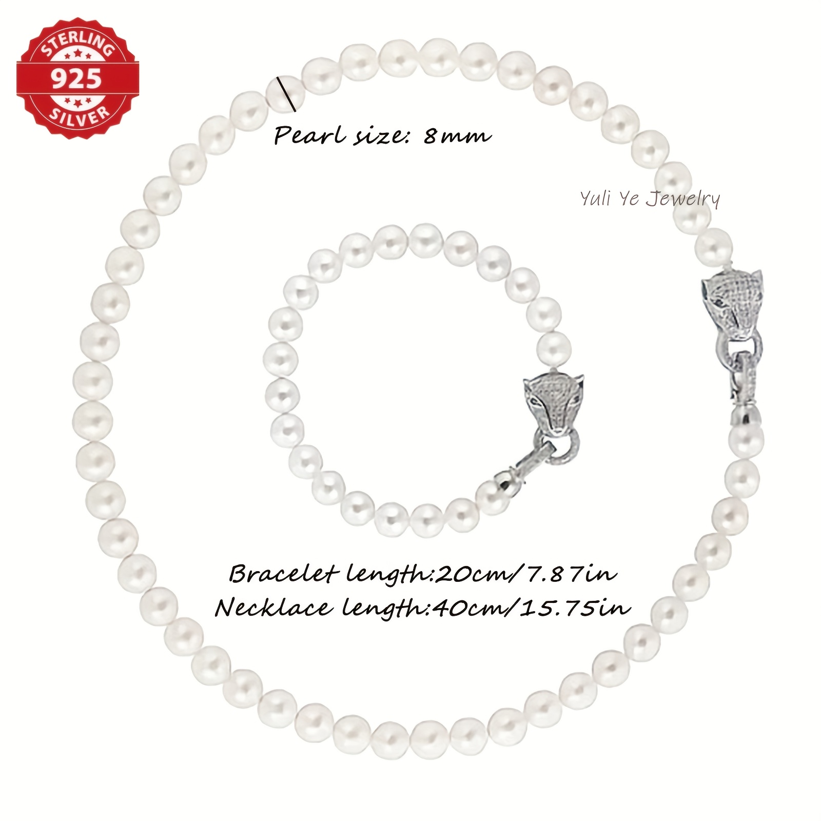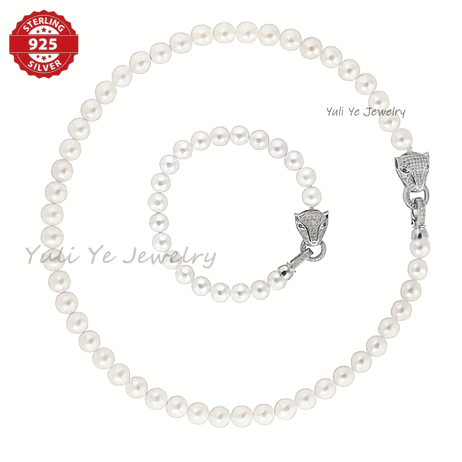 925 Silvery Plated Freshwater Pearls Bracelet Necklace Set – Elegant, Timeless Fashion with a Unique Leopard Head Clasp