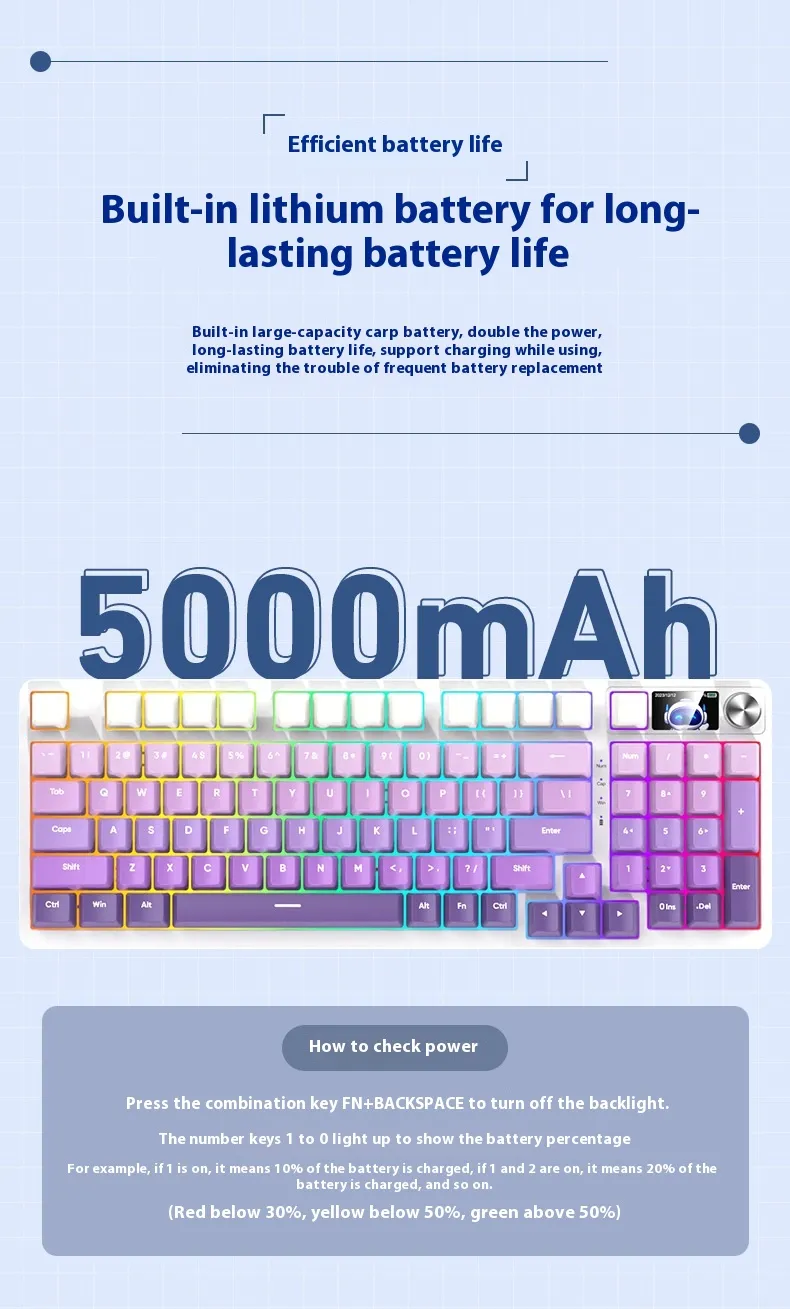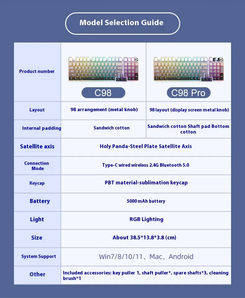 Equipped with three connectivity modes, including Bluetooth and wired options, it allows users to switch between devices effortlessly. Its mechanical-style keys provide tactile feedback for a comfortable typing experience, while the compact 98-key layout saves desk space without compromising functionality.