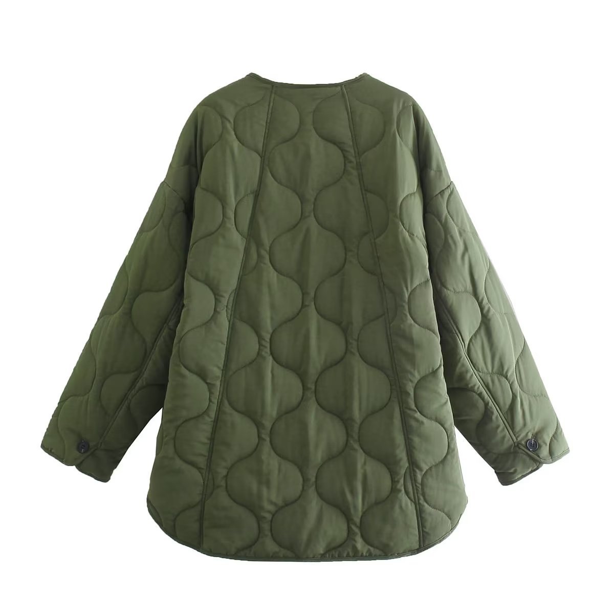 El abrigo Evergreen Elegance presenta un sofisticado patrón acolchado que le da un toque de encanto atemporal a tu atuendo. El clásico color verde oliva es versátil y combina a la perfección con cualquier conjunto, asegurándote un aspecto elegante y con estilo dondequiera que vayas.