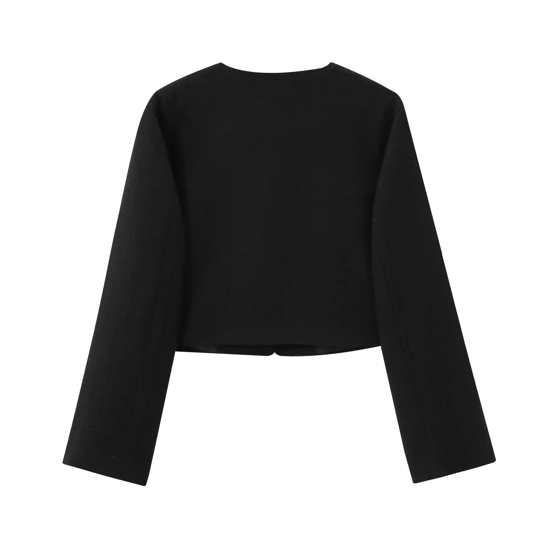 La belleza del abrigo corto de terciopelo de botonadura sencilla con cuello redondo reside en su versatilidad. Su diseño de color sólido hace que sea fácil de combinar con casi cualquier atuendo, ya sea que te vistas elegante para un evento formal o informal para una salida. Aquí hay algunas maneras de estilizarlo: