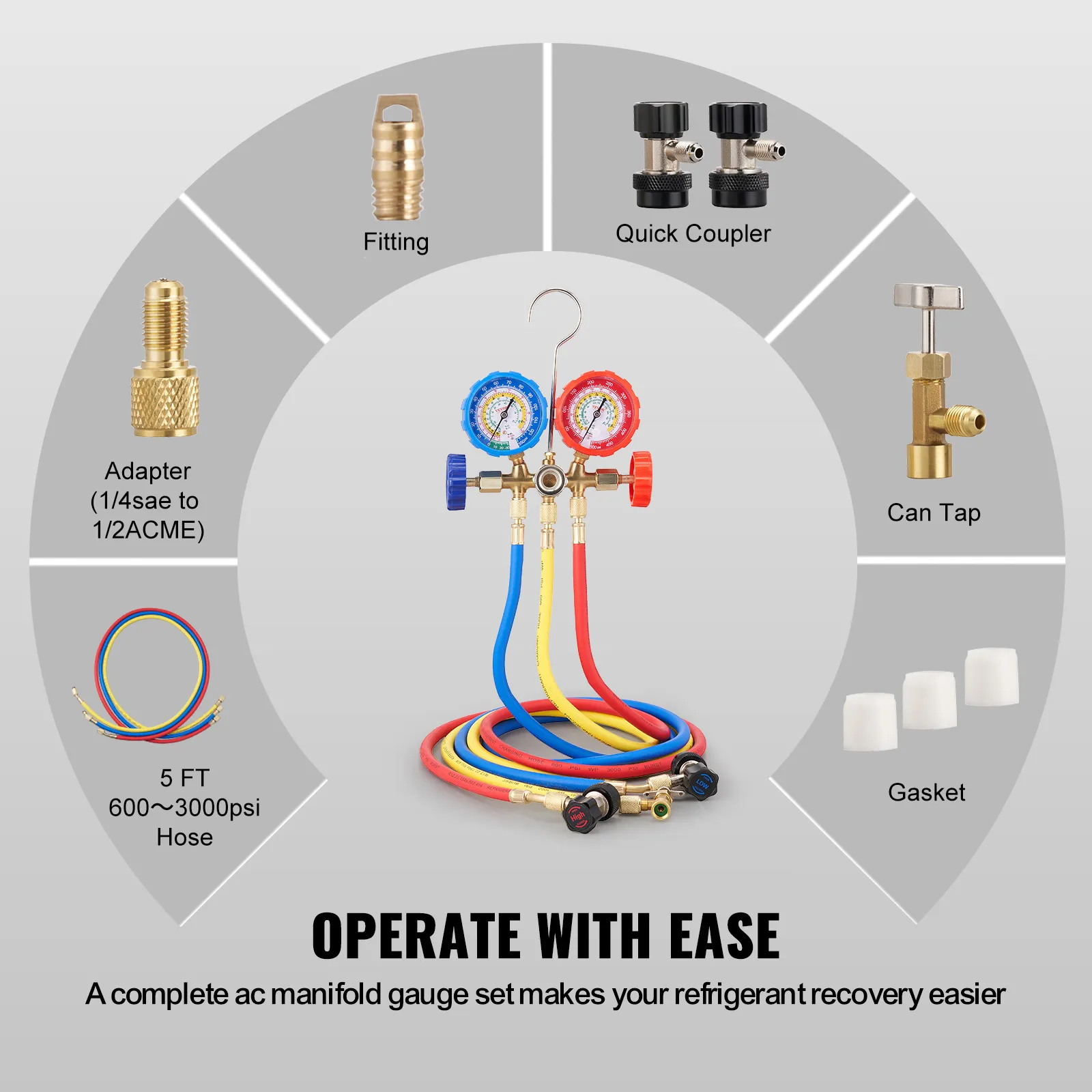Dual Gauges: The set features both high and low-pressure gauges to ensure accurate readings across various systems.