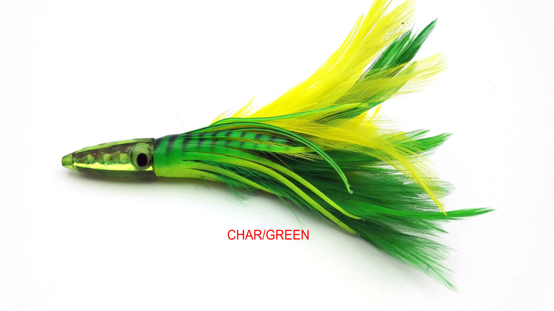- The combination of acrylic and feathers creates a realistic presentation in the water, mimicking the movement of a distressed octopus or other prey species.