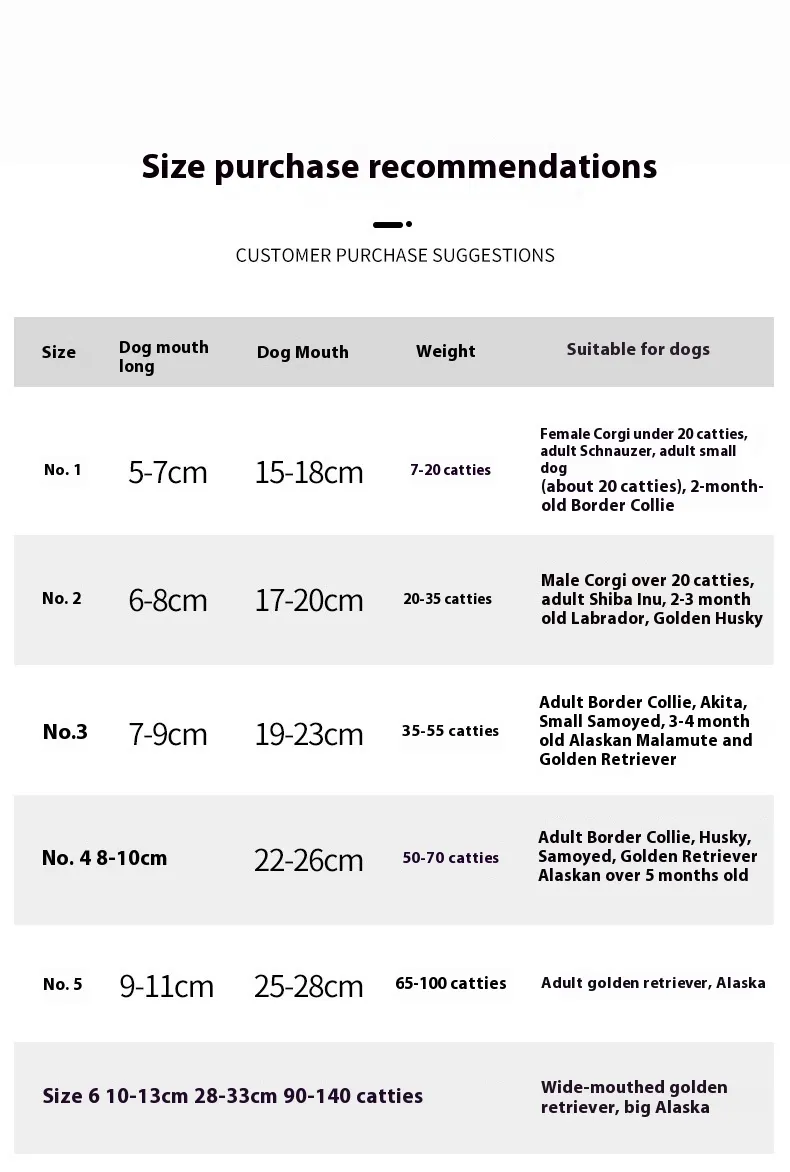 2# has a mouth circumference of 21-26cm and a mouth length of 9.0cm, 20-35 kg is recommended, 3# has a mouth circumference of 25-29cm and a