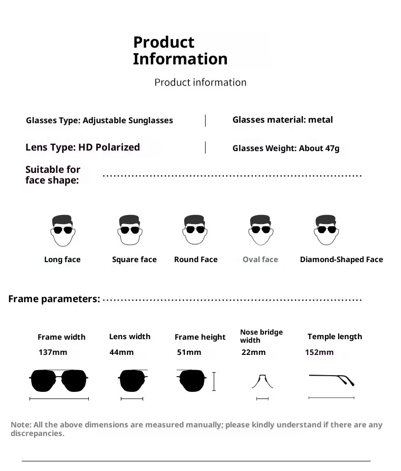 The Adjustable Dimming Sunglasses combine smart photochromic technology, protective performance, ergonomic comfort, and contemporary design to deliver a superior eyewear experience. With lenses that adapt seamlessly to changing light conditions, robust UV protection, and optional glare‑reducing polarization, these sunglasses are engineered for individuals who demand versatility, comfort, and style in one package.