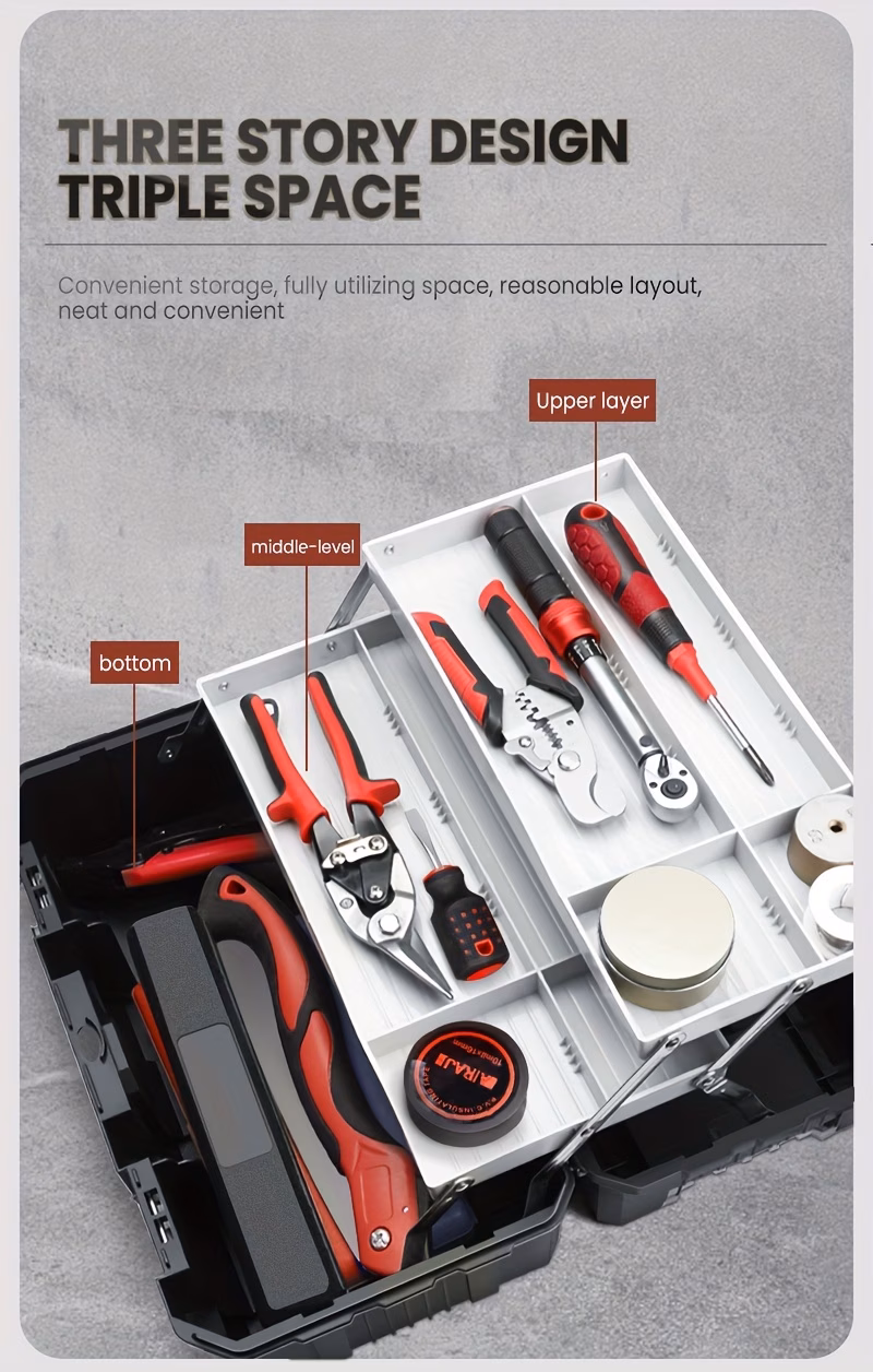 The AIRAJ Three-Layer Folding Toolbox offers a practical, organized solution for storing and accessing your hardware, tools, and maintenance items. Designed for both industrial and household use, this durable toolbox features three layers of spacious compartments that allow you to organize everything from screws and nails to washers, nuts, and bolts. Whether you’re a professional tradesperson or a DIY enthusiast, this portable, multi-functional storage box helps keep your workspace neat and your tools easily accessible.