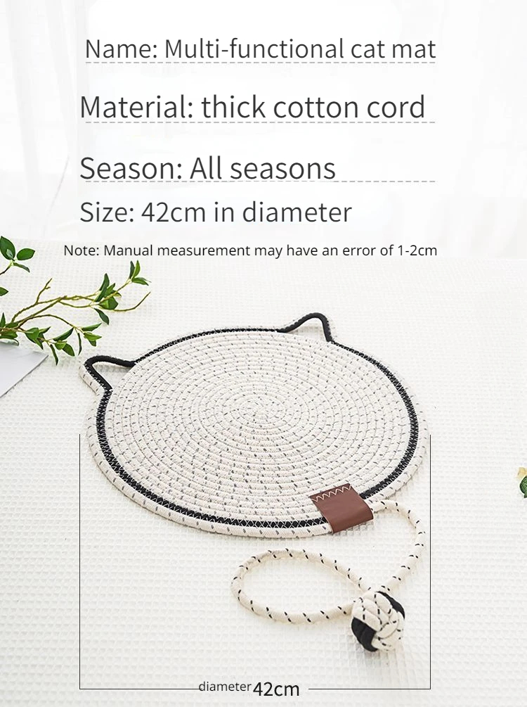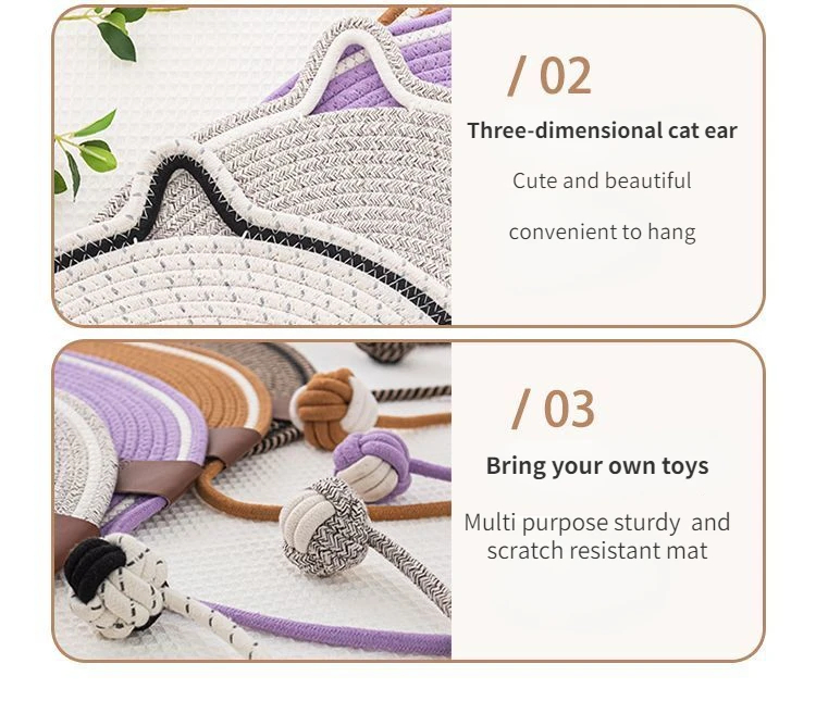 Introducción La alfombra de garra de gato de cuerda de algodón trenzada es un añadido innovador y versátil a los elementos esenciales para el cuidado de sus mascotas. Diseñada para satisfacer los instintos naturales de rascado de su gato y su necesidad de comodidad, esta alfombra funciona también como superficie para rascar y como una acogedora almohadilla para dormir. Hecho de cuerda de algodón trenzada resistente, es funcional y elegante, y se integra a la perfección con cualquier decoración del hogar.