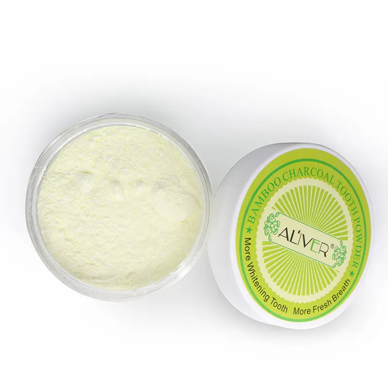 ALIVER lemon tooth powder, natural whitening tooth powder, lemon teeth brightening powder, fresh breath tooth powder, stain removal tooth powder, cosmetic dental powder, at home whitening powder, powder toothpaste alternative