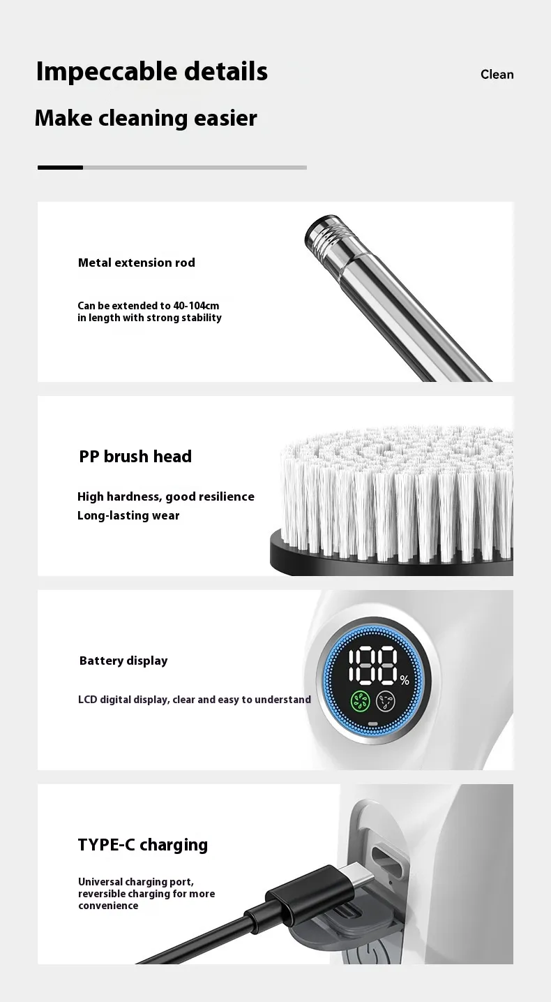 Powerful Rotating Motor: Delivers consistent high-speed spin action to loosen stubborn dirt and grime efficiently. Multiple Brush Attachments: Designed to tackle flat surfaces, grout lines, corners, and curved fixtures. Cordless and Rechargeable Design: Allows flexible movement without being restricted by power outlets. Ergonomic Handle Construction: Supports comfortable use while reducing wrist and back strain.