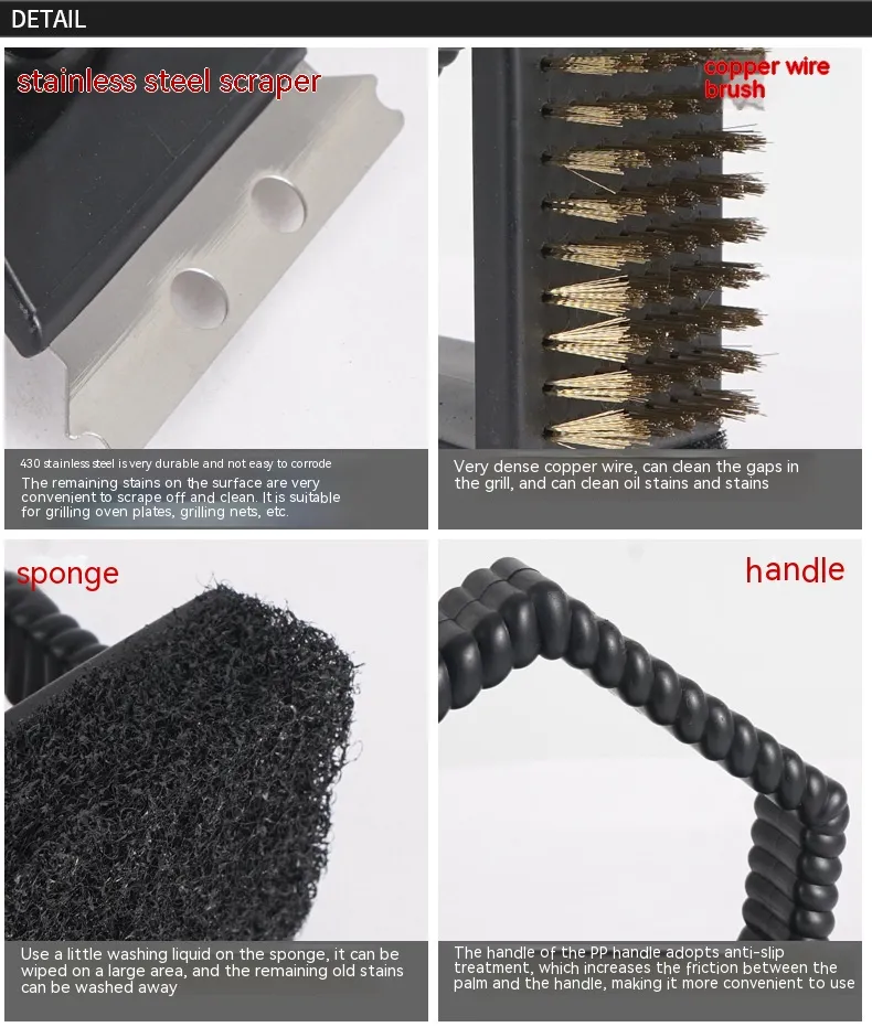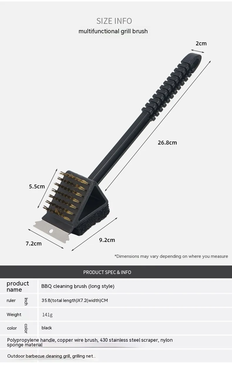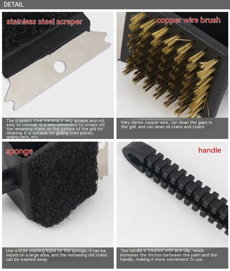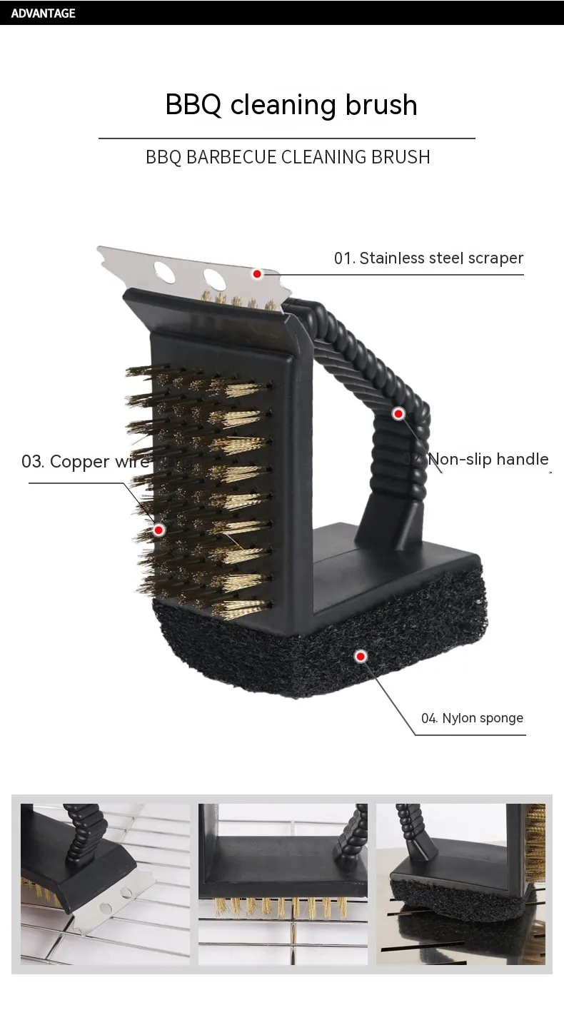 3-in-1 grill long handle cleaning brush, copper wire brush, small scraper, quick grill cleaning tool.
