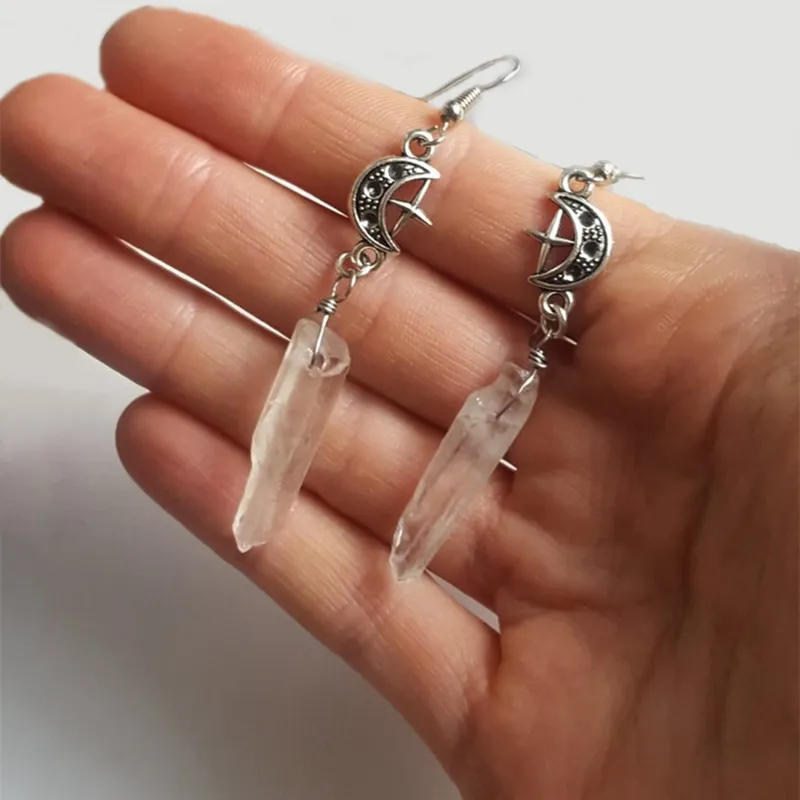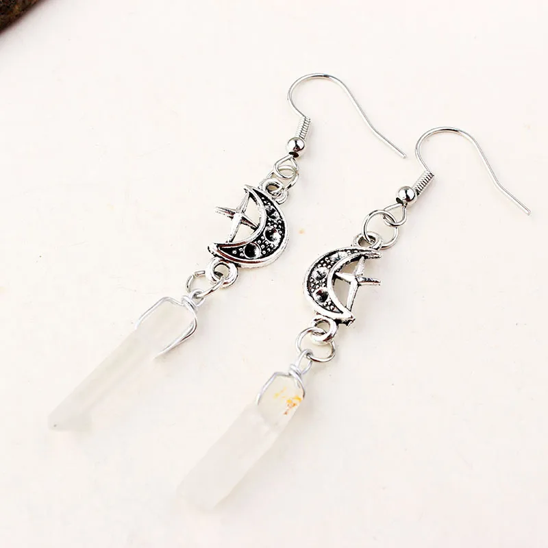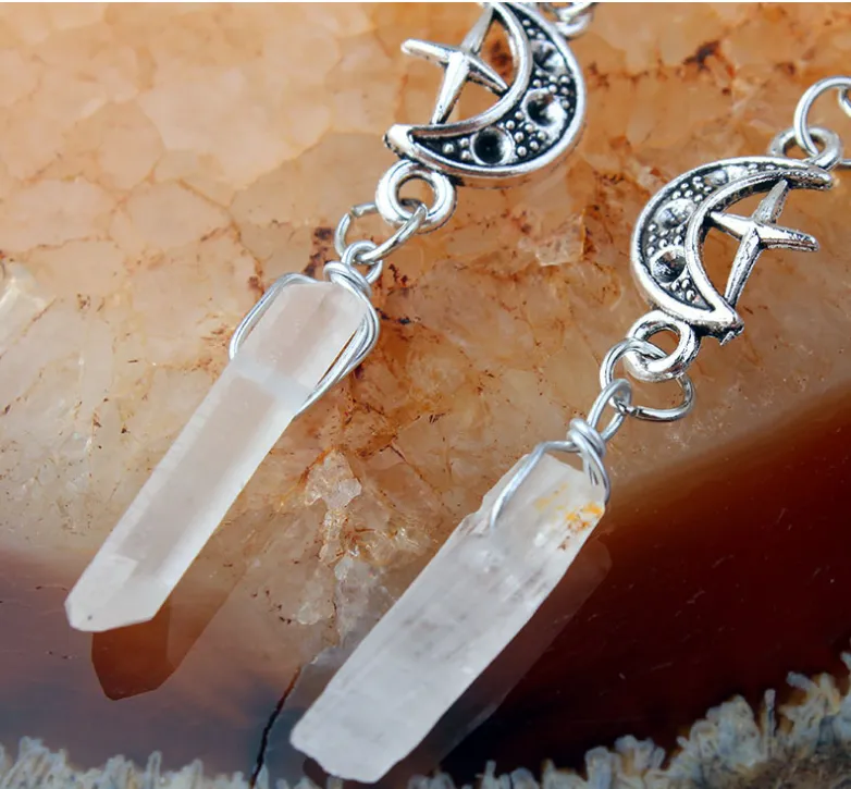 The star and moon motifs offer symbolism of guidance, light, and dreams, making these earrings a powerful reminder of inner strength and personal growth. The combination of irregular quartz stone and celestial elements brings a sense of peace and energy to your wardrobe.