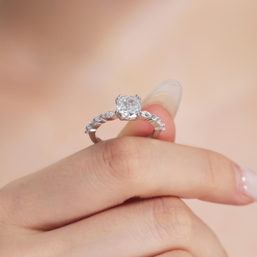- Deslumbrante pieza central: El anillo presenta un magnífico diamante de talla cojín como pieza central, disponible tanto en impresionantes opciones de color rosa como en el clásico blanco. El corte cojín maximiza el brillo del diamante, creando un destello cautivador que llama la atención.
