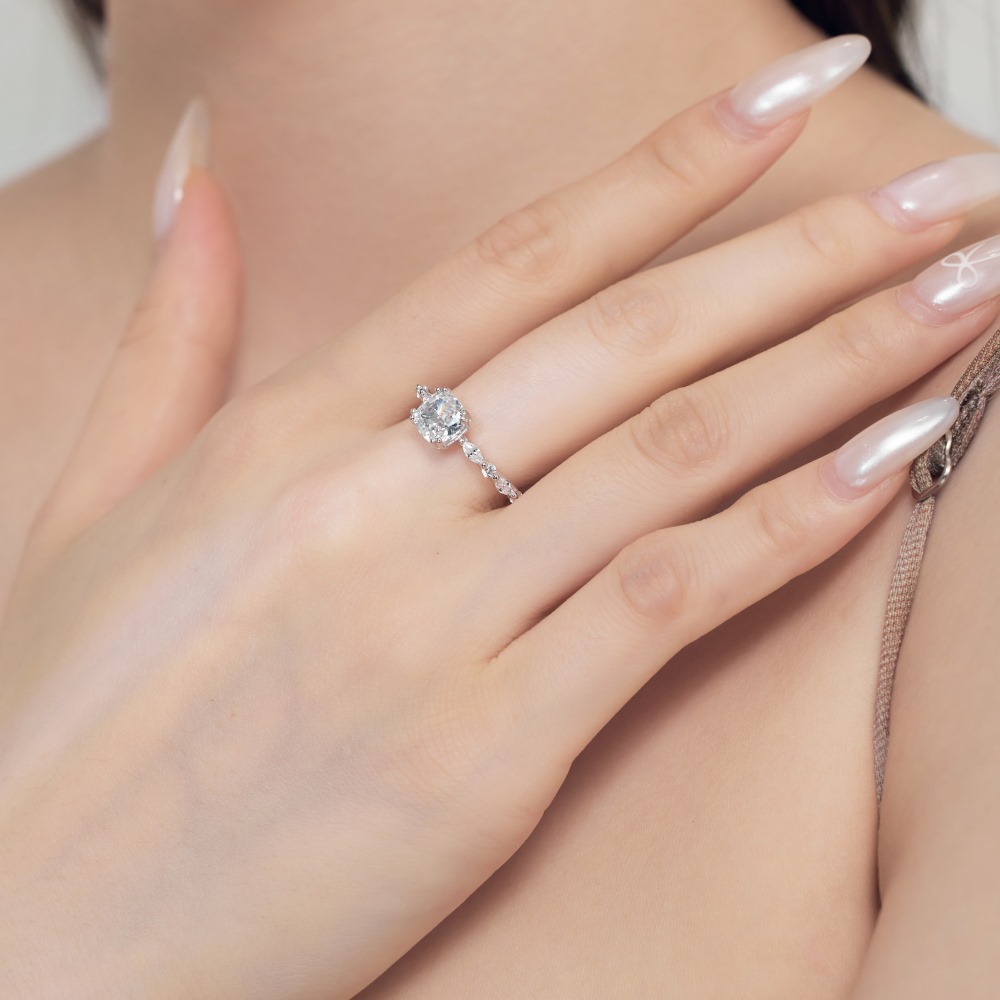 - Anillo elegante: El anillo de plata de ley está adornado con pequeños detalles de diamantes, que realzan el brillo general y realzan el atractivo lujoso del anillo. El diseño del anillo complementa el diamante central, creando una apariencia armoniosa y elegante.