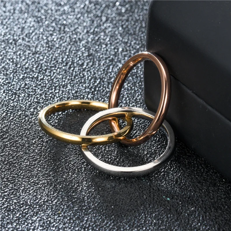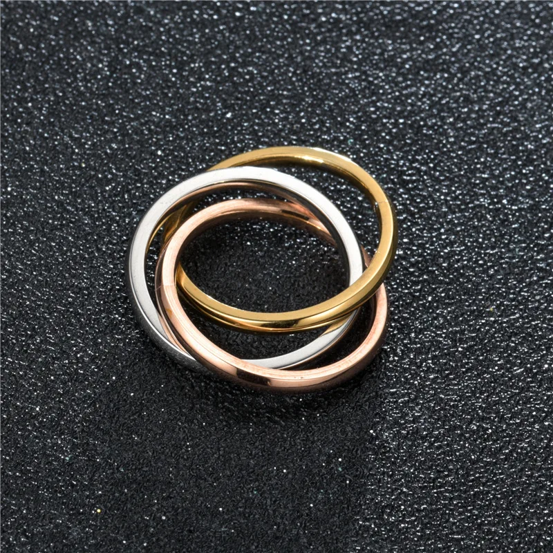 Anillo de pareja entrelazado de tres anillos apilados de acero inoxidable chapado en oro para mujer.