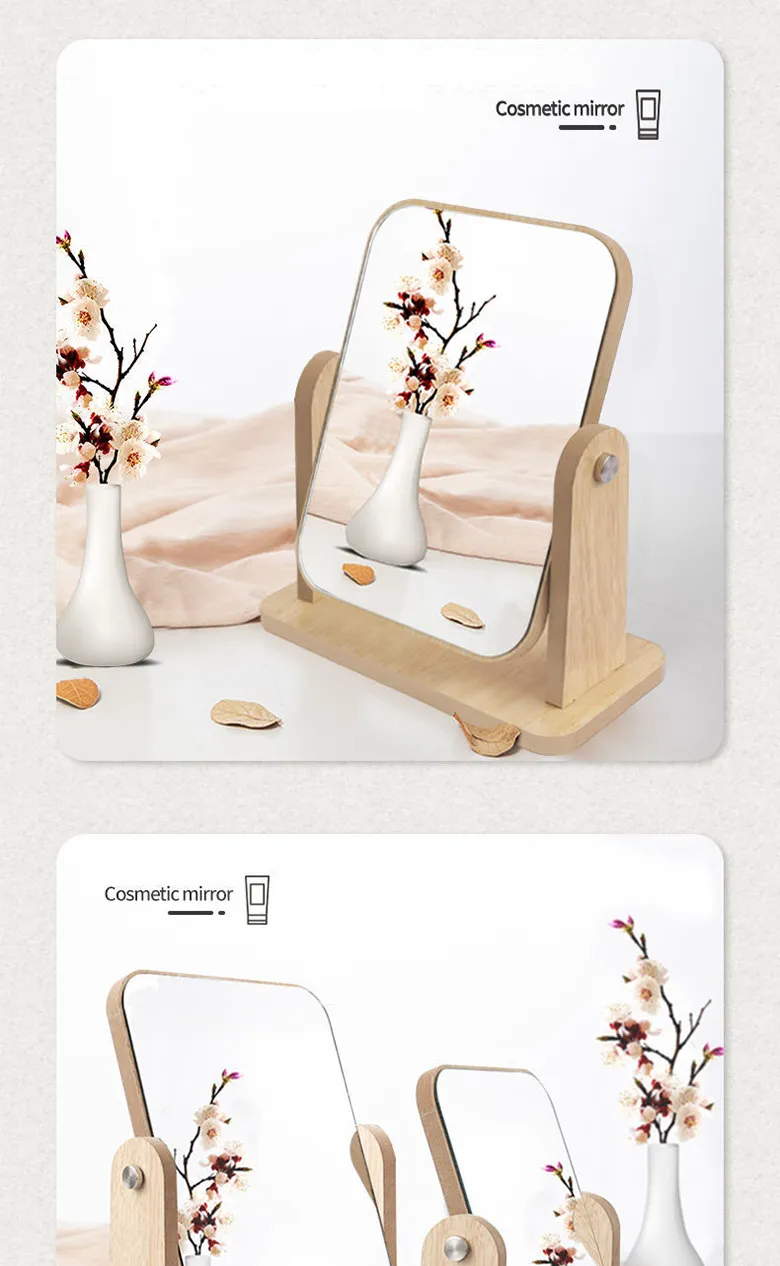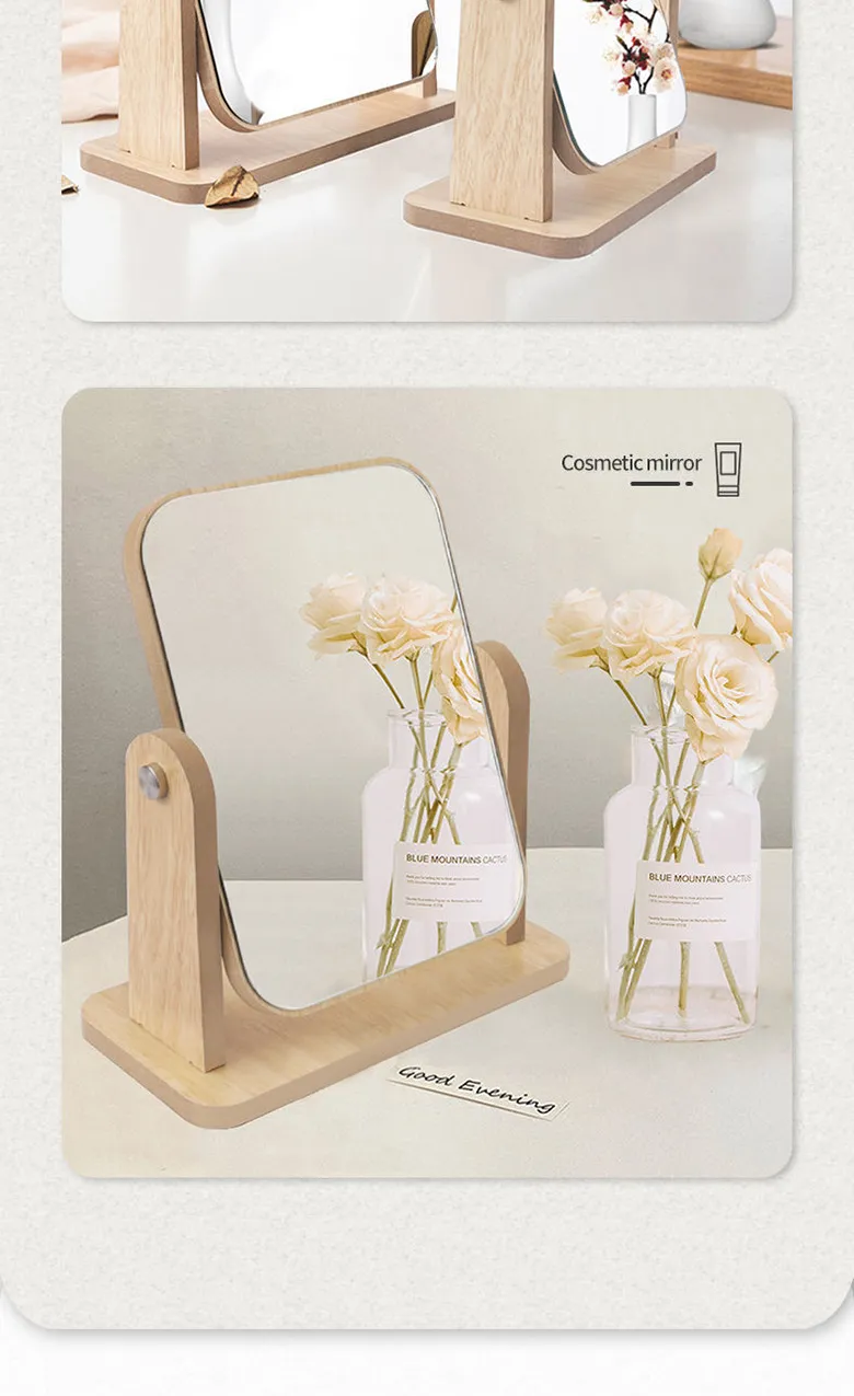 Crafted with a natural wood frame and a large, clear glass mirror, it features a 360° swivel design for the perfect viewing angle. Ideal for desktop use in bedrooms, dormitories, or vanities.