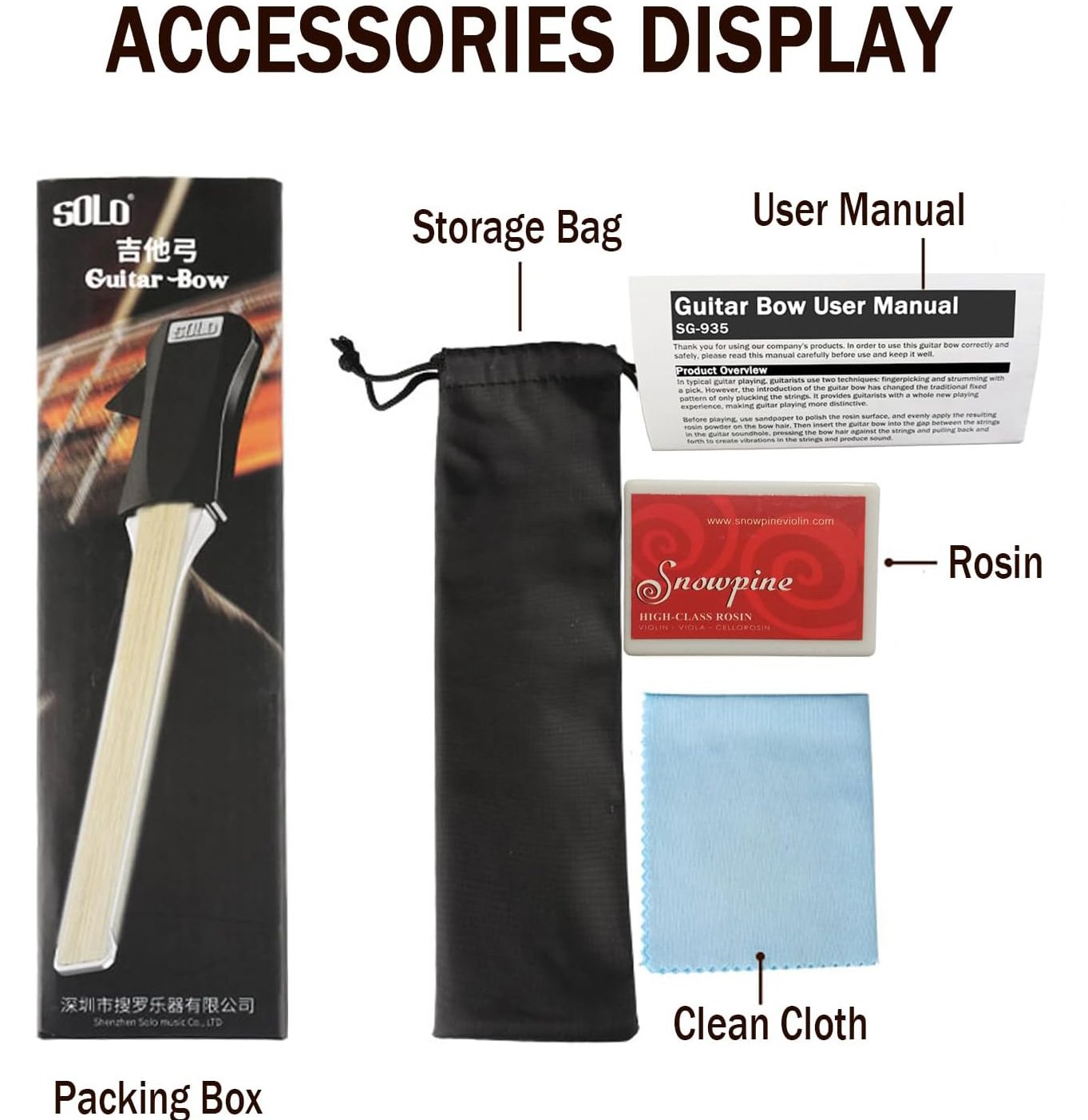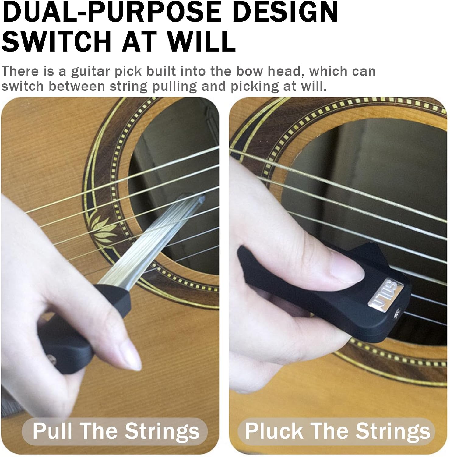 Puedes tocar cuerdas simples o dobles a la vez, ya que nuestro arco tiene pelos en ambos lados. Púa de guitarra incorporada en el mango, que te permite cambiar la púa de guitarra al arco inmediatamente.