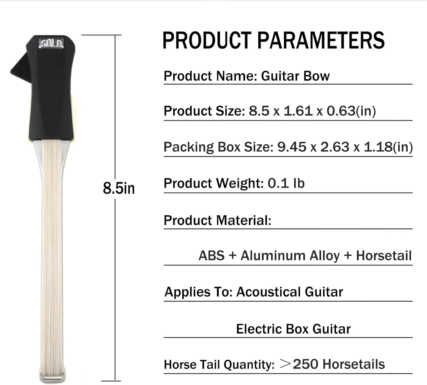 El arco para tocar la guitarra mide 8,5 pulgadas Mide solo 0.1 libras de largo y pesa solo 0.1 libras. Guárdalo en tu funda de guitarra y llévalo a todas partes. Aprenderás a tocarlo en minutos. Incluye una funda para arco, una caja de resina, un paño de limpieza y un manual de usuario.