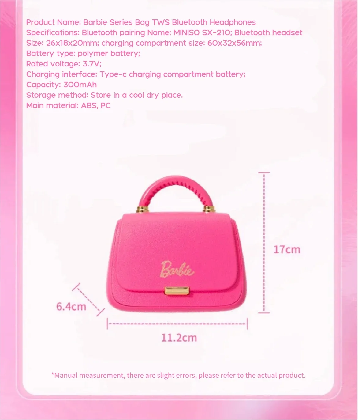 Audífonos Bluetooth TWS originales MINISO Barbie, color rosa, con forma de bolso creativo y bonito, ideal como regalo navideño para niñas.