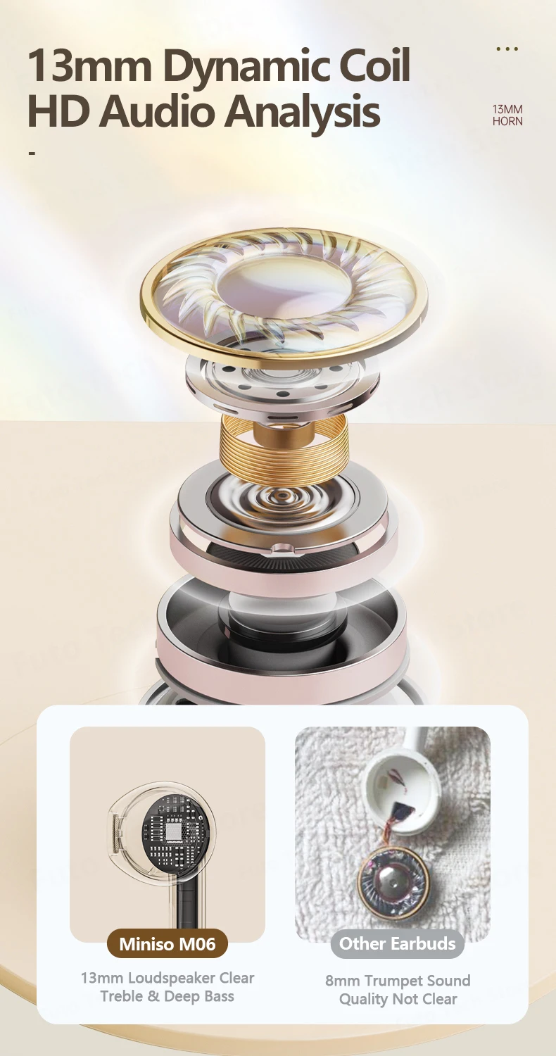 [Miniso M06]: Altavoz de 13 mm con agudos nítidos y Graves profundos vs. [Otros auriculares]: La calidad del sonido de la trompeta de 8 mm no es nítida
