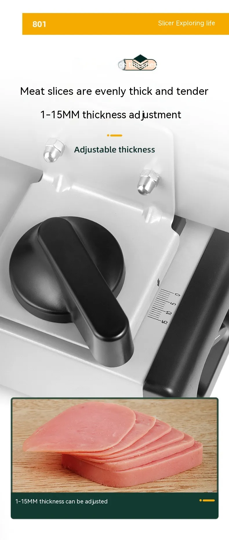 Featuring adjustable slicing thickness, the Automatic Home Use Slicer ensures that you can customize the thickness of your slices to suit your specific needs—whether you prefer thin, medium, or thick slices of bread or lamb roll. Its user-friendly design and powerful motor ensure smooth, consistent results with minimal effort. The slicer is perfect for home chefs who want to save time and achieve consistent slicing for sandwiches, roasts, or other culinary creations.