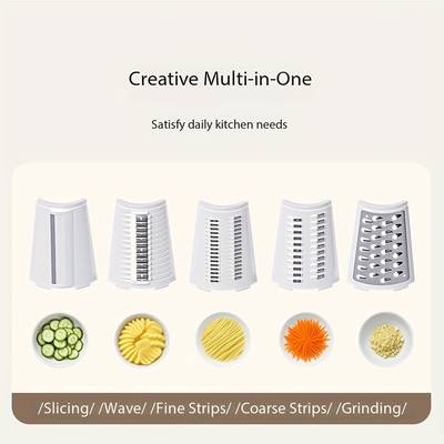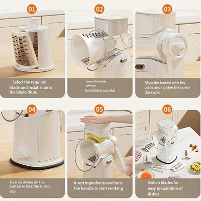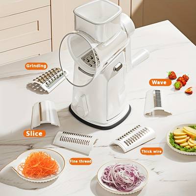 This manual slicer uses a rotating handle mechanism that allows you to grate cheese, slice vegetables, shred potatoes, chop nuts, and prepare salad ingredients with minimal effort.