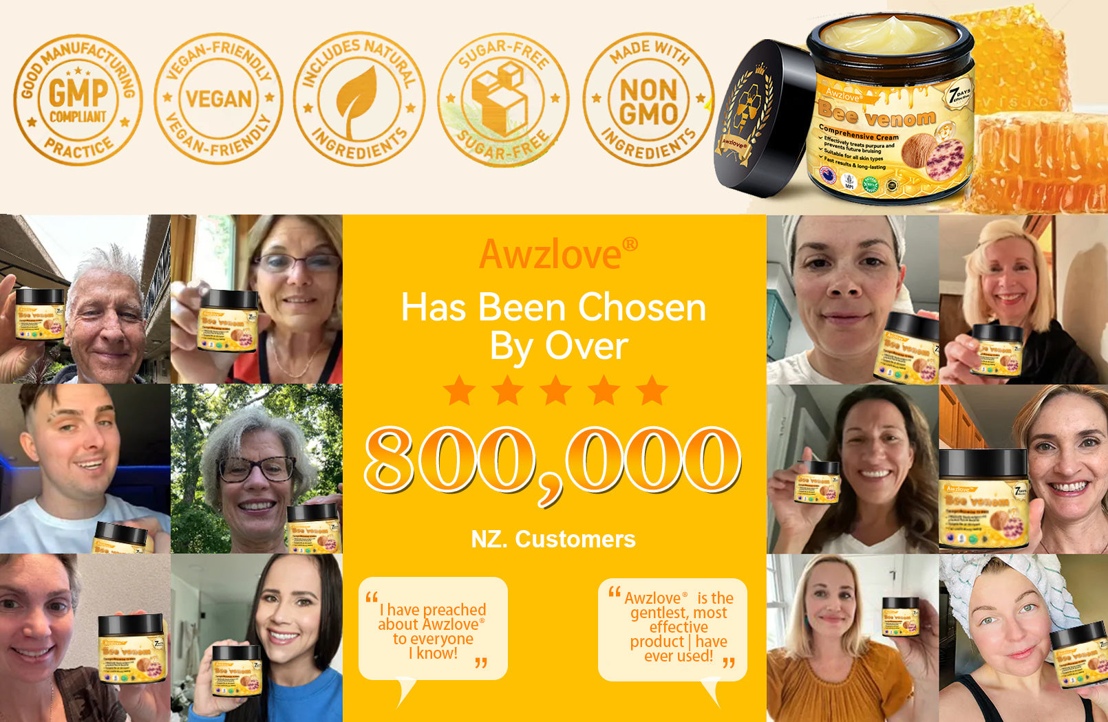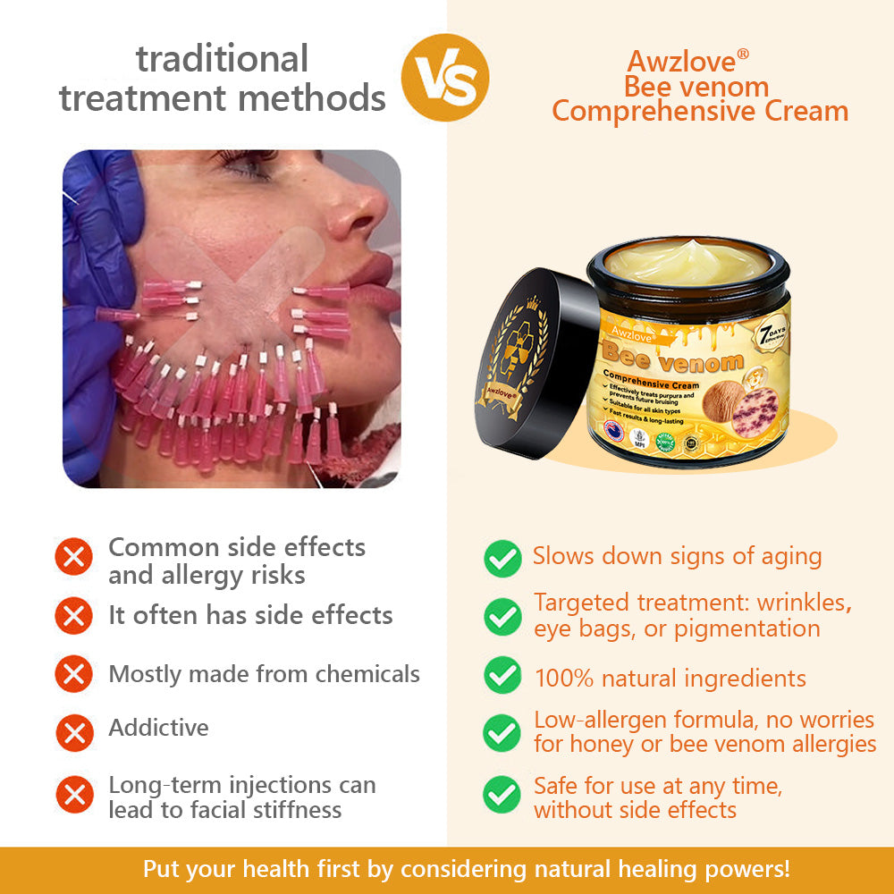 AWZLOVE® Bee Venom Comprehensive Cream provides a clinically-tested, powerful solution to combat wrinkles, skin laxity, and more, offering noticeable improvements in just 7 days. Say goodbye to harsh chemicals and invasive treatments, and say hello to younger, firmer, and more vibrant skin. If it doesn’t work, we offer a 100% money-back guarantee!