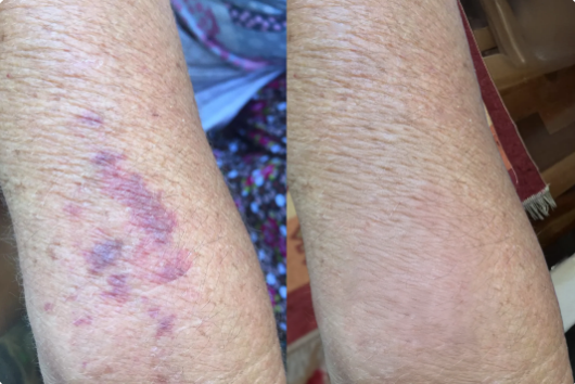My doctor said it's senile purpura, caused by aging skin and weak blood vessels. I had tried so many creams before, but nothing really