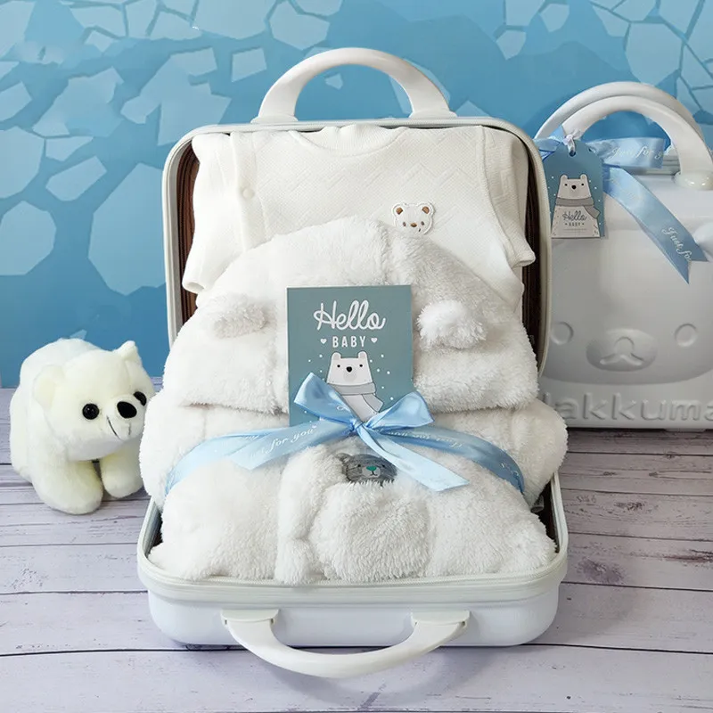 The centerpiece of the Baby Gift Box is the polar bear romper jumpsuit itself. Made from high-quality materials, the jumpsuit features a cute bear design with embroidered details, such as the bear’s face and ears, that make it stand out. The thick quilted fabric ensures warmth, while the soft interior guarantees comfort for the baby. Whether it's worn during naps, playtime, or outings, this romper provides the perfect balance of practicality and style.