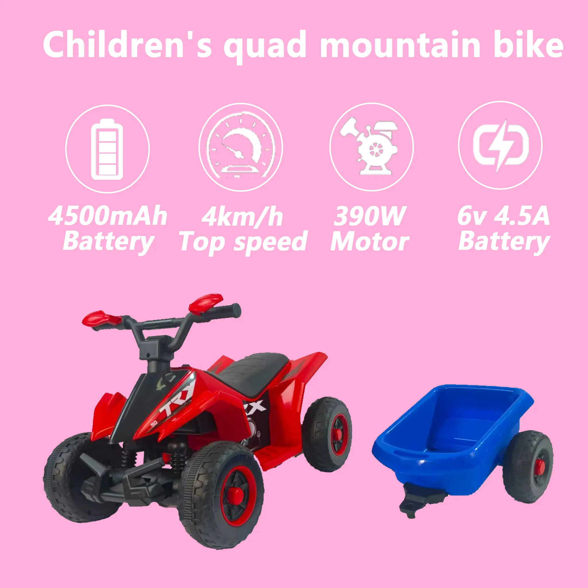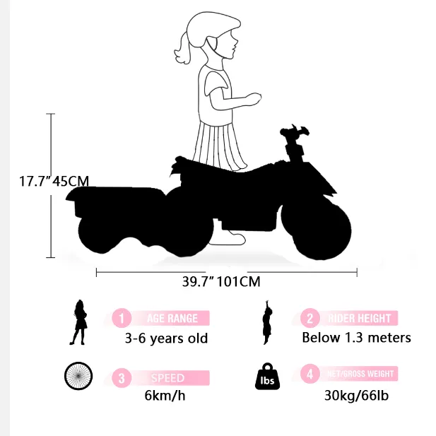 - Constructed for durability, this kid's ATV boasts realistic features and a bright headlight to spark imagination and adventure. It includes a music control panel and five music for endless entertainment. What's more,some toys and pets can be placed behind the funnel at the back of the vehicle.