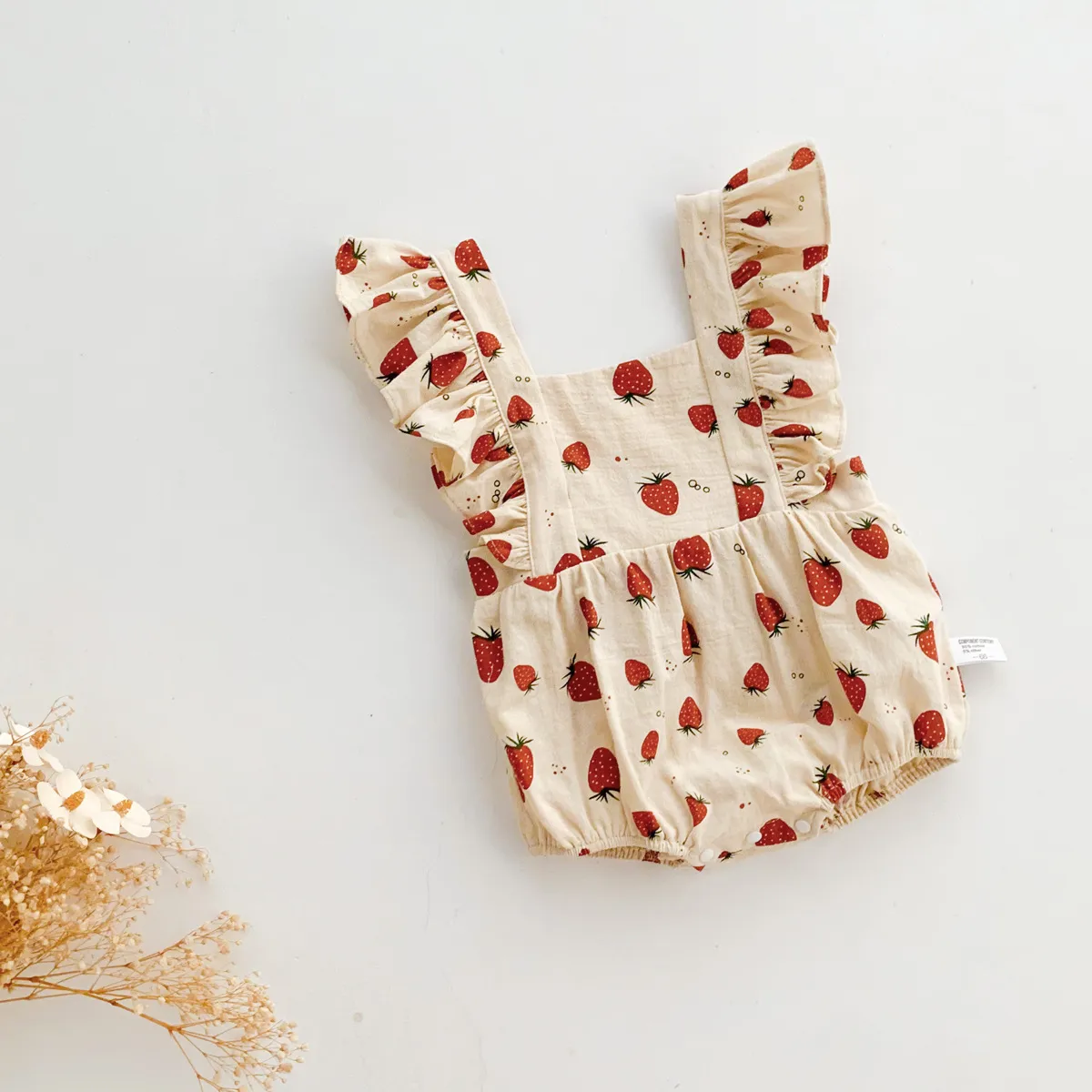 One‑Piece Rompers: Featuring red bodies with soft green trims around collars and sleeves, detailed strawberry embroidery,