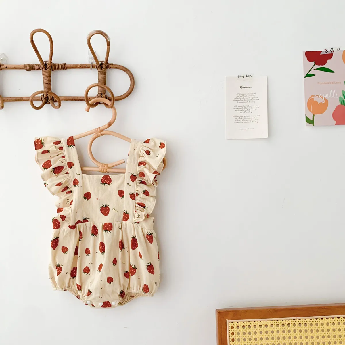One‑Piece Rompers: Featuring red bodies with soft green trims around collars and sleeves, detailed strawberry embroidery,