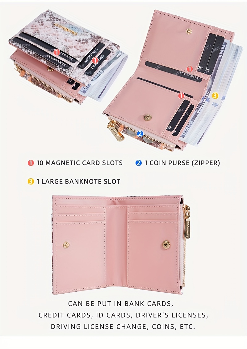 Featuring an eye-catching snake-pattern exterior, multi-card slot design, secure press-buckle closure, internal money clip, and zippered coin purse, this wallet is perfect for women who prefer a compact accessory without sacrificing storage space. Lightweight, trendy, and easy to carry, it complements handbags, crossbody bags, totes, and pockets effortlessly.