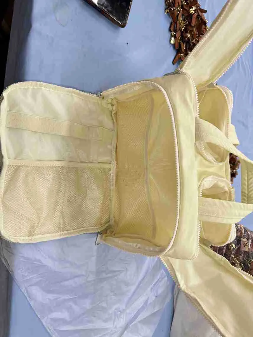 Multiple Compartments: The bag includes several mesh pockets and elasticized straps, allowing you to store toiletries and