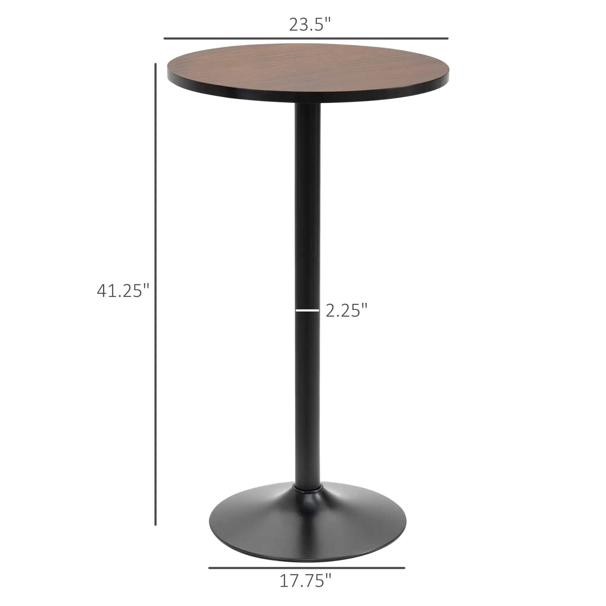 Marrying the design aesthetics of industrial machinery and rustic cabin styles, this table features a weathered wooden top, smooth matte black steel body, and solid, stable steel base. The round table top is made of beautiful elm wood that has been treated to look antique. The 23.5" diameter table top also provides space for drinks and small foods, while occupying reduced space compared to larger tables. Bring a little extra character into your spaces with this amazingly unique table. Features: - Simple yet stylish, the rustic industrial design adds raw sophistication to any space - Elm wood table top features a polished finish with an anti-scratch weathered look - Rust-resistant metal frame for extra sturdy and stable support - Industrial steel is powder coated in matte black for a stylish look and feel - Perfect standing table for bar, coffee shop, or settings - Easy and quick to assemble with instruction and hardware included Specification: - Color: Brown, Black - Material: Steel, Elm - Overall Dimensions: 23.5"(Dia) x 41.25"H - Base Diameter: 17.75" - Net Weight: 35 lbs - Weight Capacity: 66 lbs.
