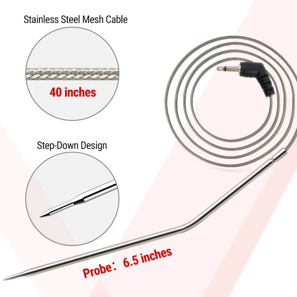 precisely and quickly. 40" stainless steel mesh cable connects thermometer to base, outside of oven