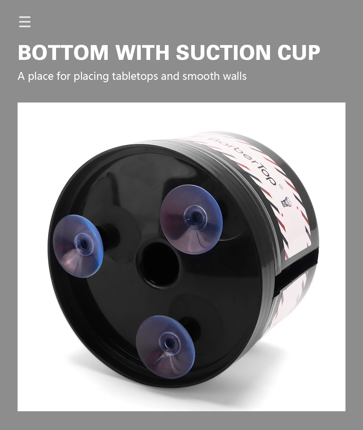 With suction cup at the bottom, it can be fixed on a flat surface.