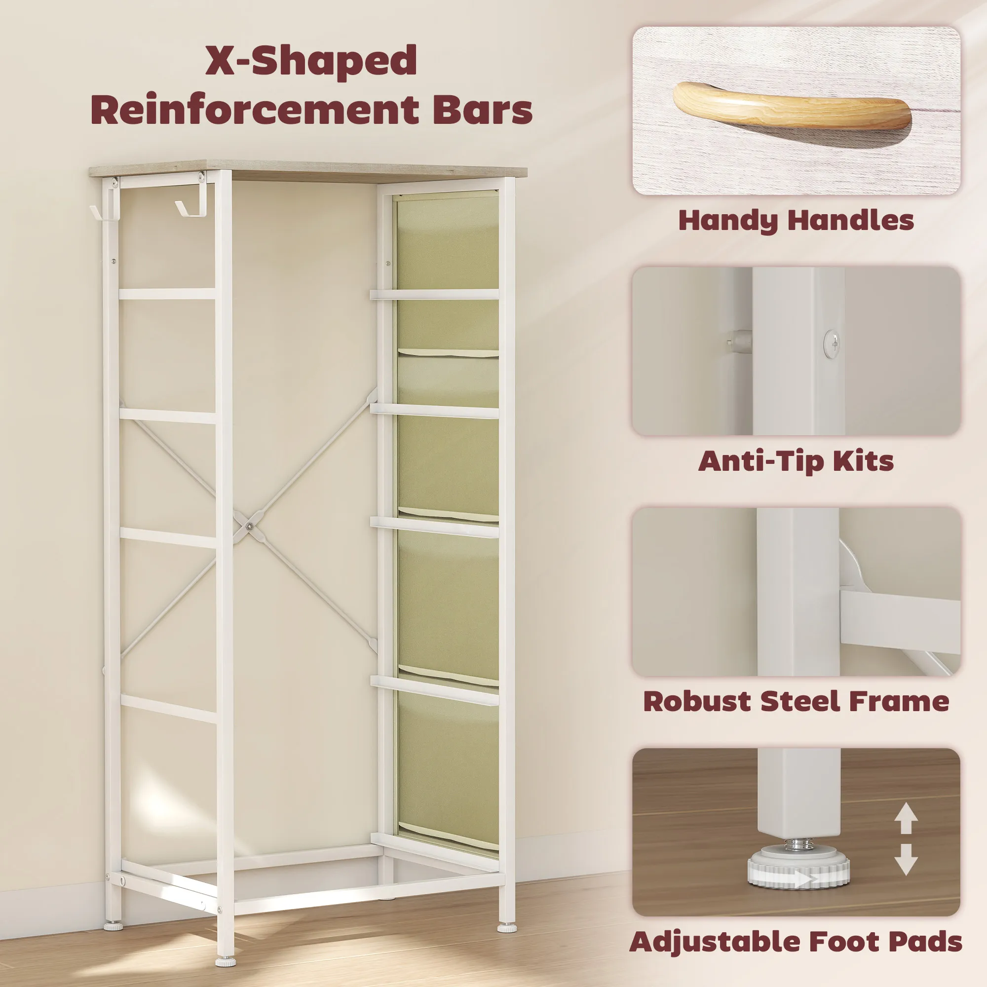 Easy, simple storage with this fabric chest of drawers. With three small and two large drawers, it's easy to sort everything from socks to pants. It also features four side pockets and two hooks to get smaller accessories altogether. A steel frame with X-bars keeps this bedroom dresser stable, finished with adjustable feet for balance - even on unsteady grounds.