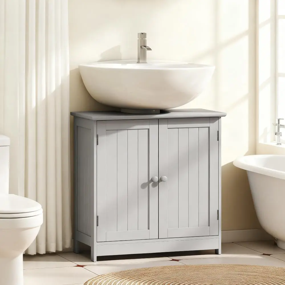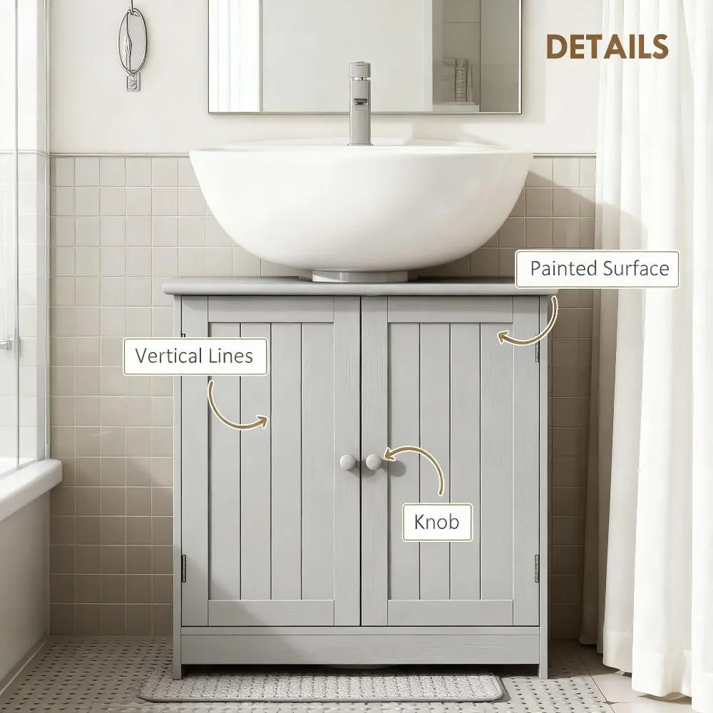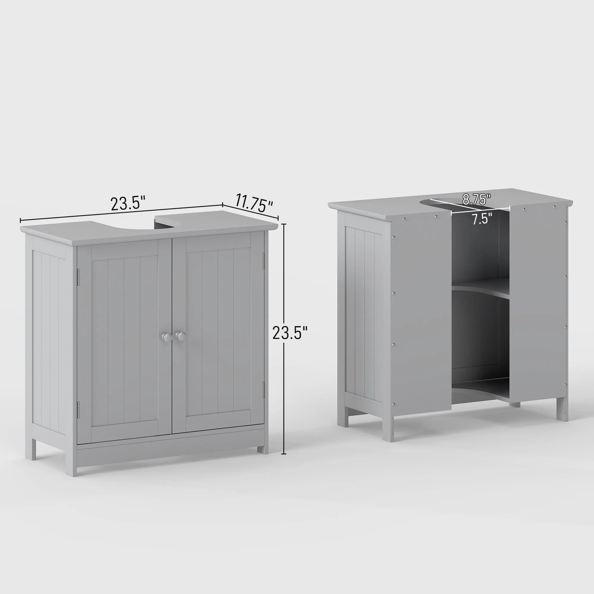 Features: - Under sink vanity cabinet combines contemporary style with ample storage space - Open back design so the vanity can be assembled under or beside your pedestal sink - Solid MDF frame ensures your stable daily use - An adjustable shelf to store bathroom essentials or cleaning products in a convenient place - Assembly required Note: Make sure to measure the sink before purchasing. Specification: - Color: Light Gray - Material: MDF - Overall Dimensions: 23.5" L x 11.75" W x 23.5" H - Opening Slot Size: 7.5" W x 8.75" D - Cabinet Inner Size: 21.25" W x 10.25" D x 10"/9.75" H - Weight Capacity: 33 lbs. (total), 11 lbs. (each shelf) Package Includes: - 1 x Bathroom Vanity - 1 x Manual