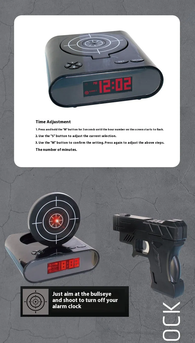 - Step 4: When the alarm rings, pick up the gun, aim at the target, and shoot to turn off the alarm.