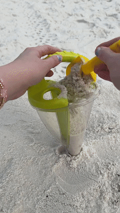 Fill one part of the tool with water, the other with sand. Watch the water and sand mix in the transparent container and decorate for maximum spilling fun! Please note: This funnel works best with fine sand. Using a sieve prior to use helps to ensure that no rocks or pebbles will clog the mixing action of the sand funnel.