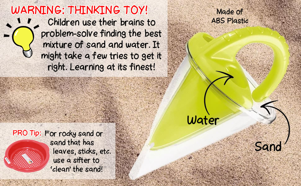 Fill one part of the tool with water, the other with sand. Watch the water and sand mix in the transparent container and decorate for maximum spilling fun! Please note: This funnel works best with fine sand. Using a sieve prior to use helps to ensure that no rocks or pebbles will clog the mixing action of the sand funnel.