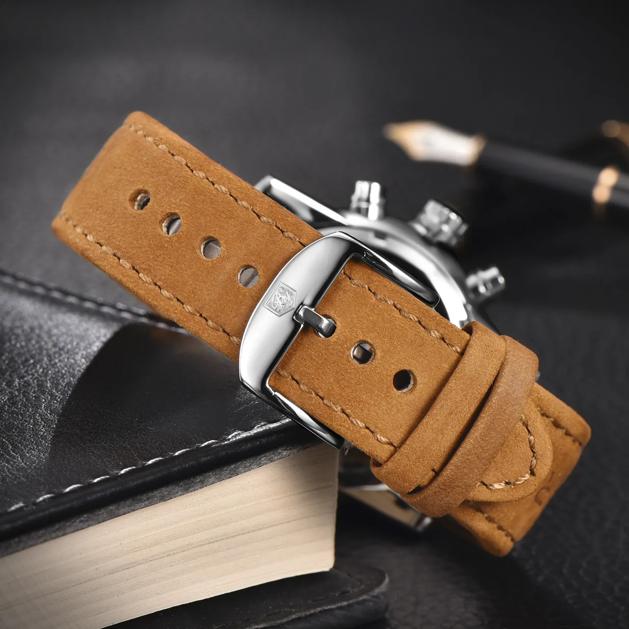 Bold and Stylish Design: The three sub-dials and sleek leather strap create a sporty yet elegant design that complements