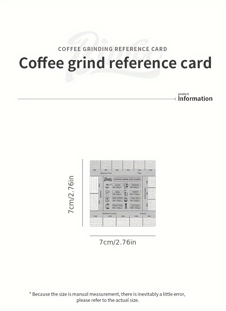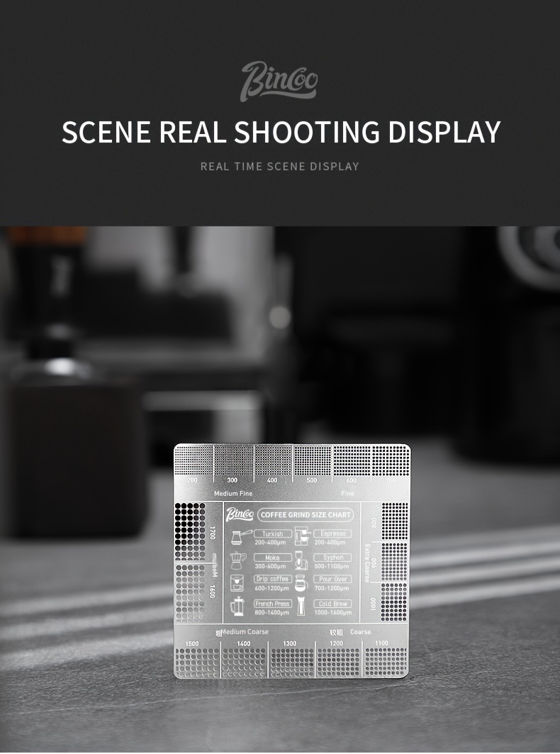 The Bincoo Coffee Bean Grinding Scale Reference Card is a professional-grade comparison guide designed to help users visually and practically understand grind thickness, powder texture, and particle size for different brewing methods. Built with precision-printed markings, this reference tool provides accurate grind-level illustrations ranging from fine espresso powder to coarse French press textures. It serves as a clear, dependable comparison chart for both beginners and advanced brewers who need repeatable results.