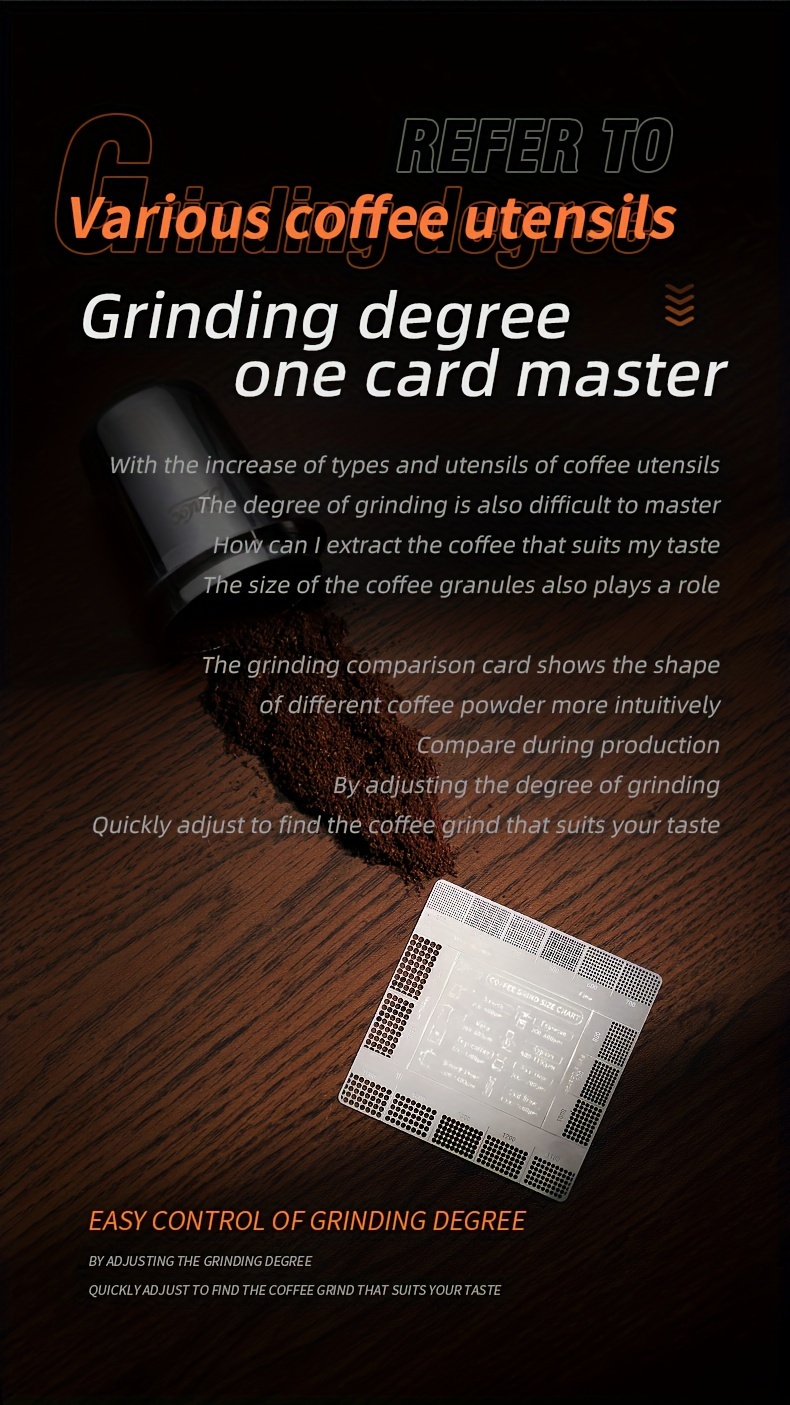The card displays accurate grind level comparisons, helping users instantly identify whether their coffee powder is too fine, too coarse, or