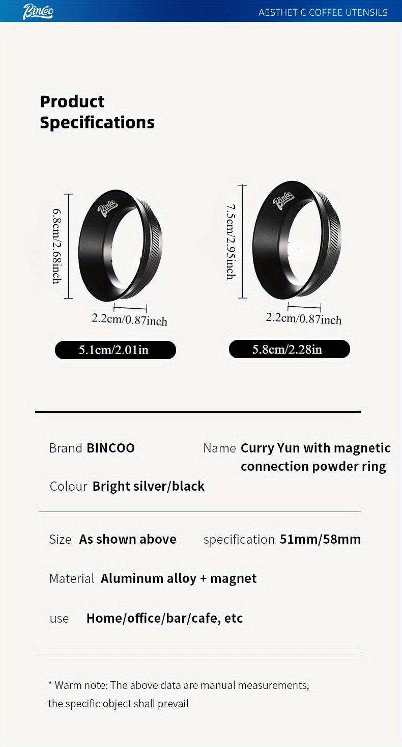 The Bincoo Magnetic Coffee Dosing Ring offers a combination of precision, durability, and ease of use that many generic plastic funnels cannot match. Its magnetic design ensures a stable, perfectly aligned fit on 51mm/58mm portafilters, reducing workflow interruptions and improving accuracy.