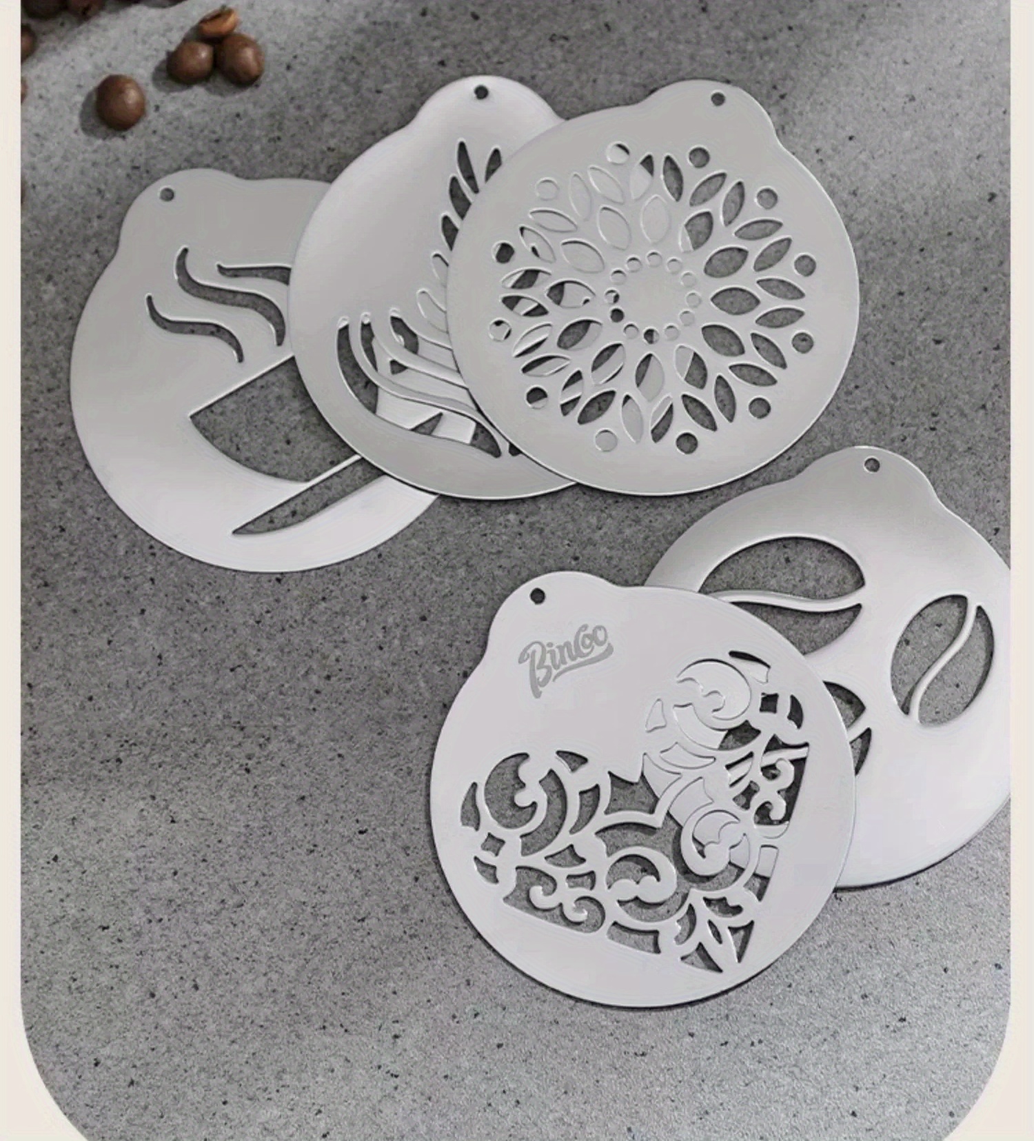 Bincoo Stainless Latte Art Mold Set – 5pcs Coffee Pattern Stencil Kit