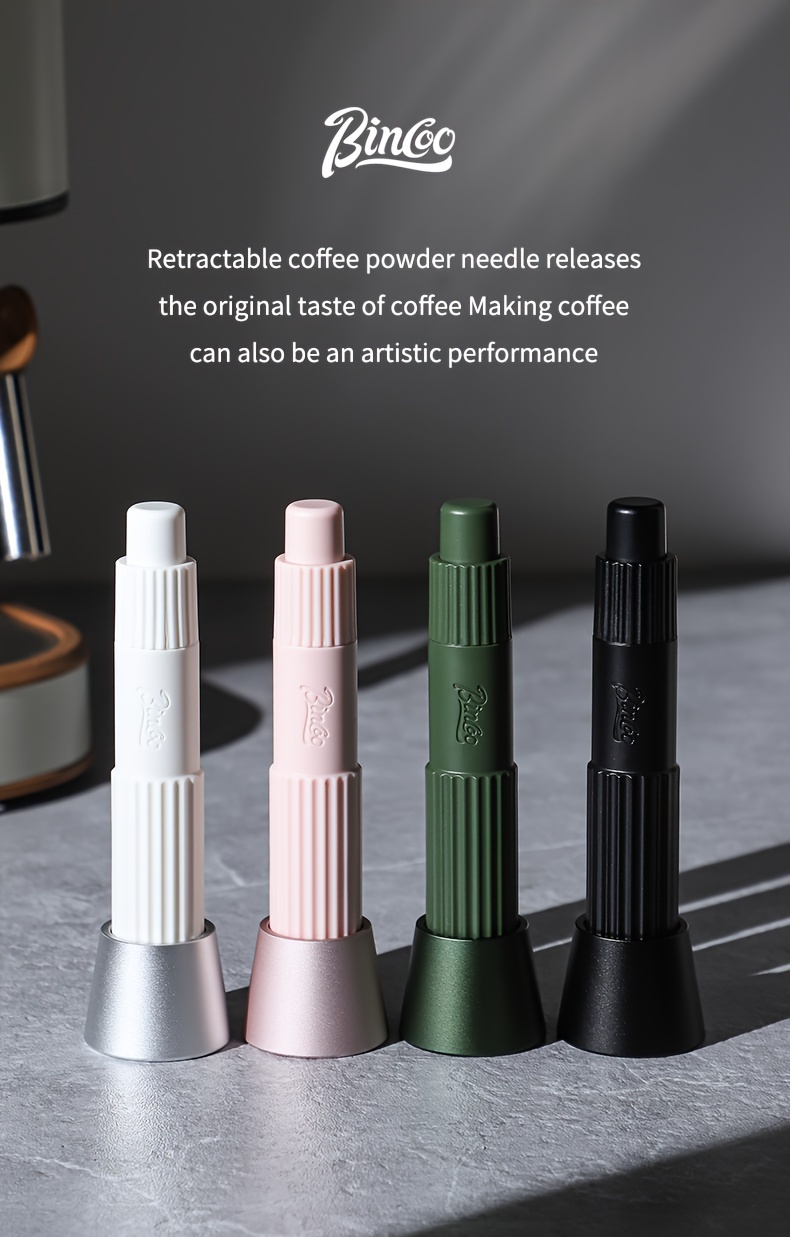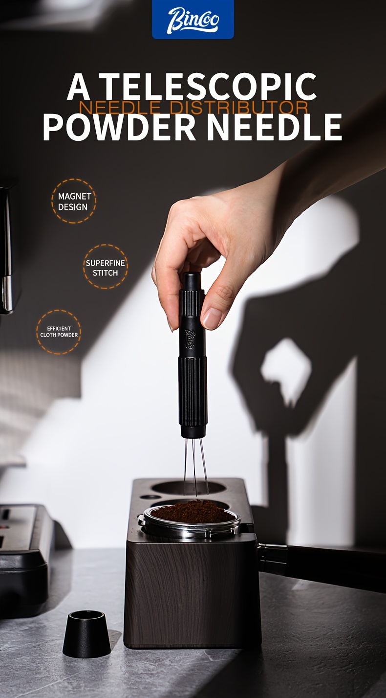 The Bincoo Coffee Powder Needle Dispenser is a stainless-steel espresso distribution tool designed to improve puck consistency by evenly breaking up clumps and aerating coffee grounds before tamping. Equipped with a telescopic magnetic mini needle, it offers precision control, smooth motion, and stable handling for professional-level puck preparation.