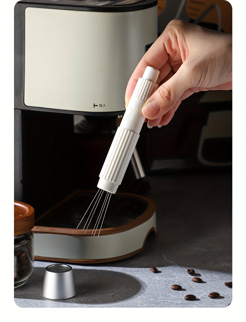 The stainless-steel body provides durability, corrosion resistance, and long-term reliability, while the telescopic design allows the needle to extend and retract smoothly for targeted distribution. The magnetic element helps secure the tool during use and storage, keeping it attached to metal surfaces such as espresso machines, grinders, or barista stations.