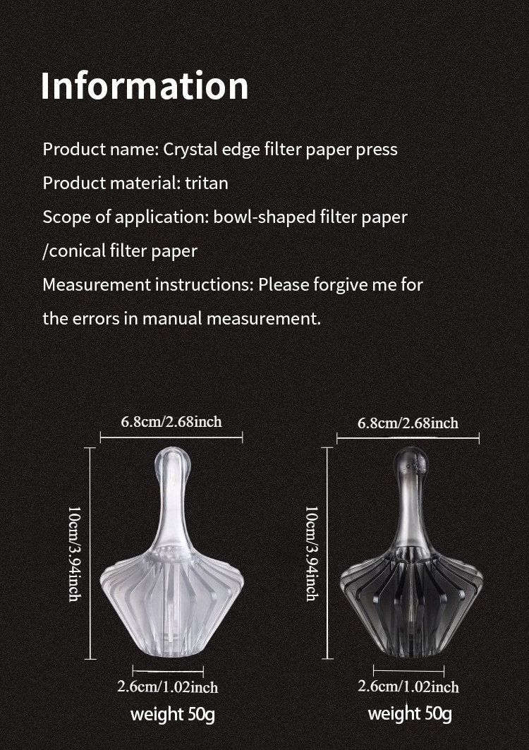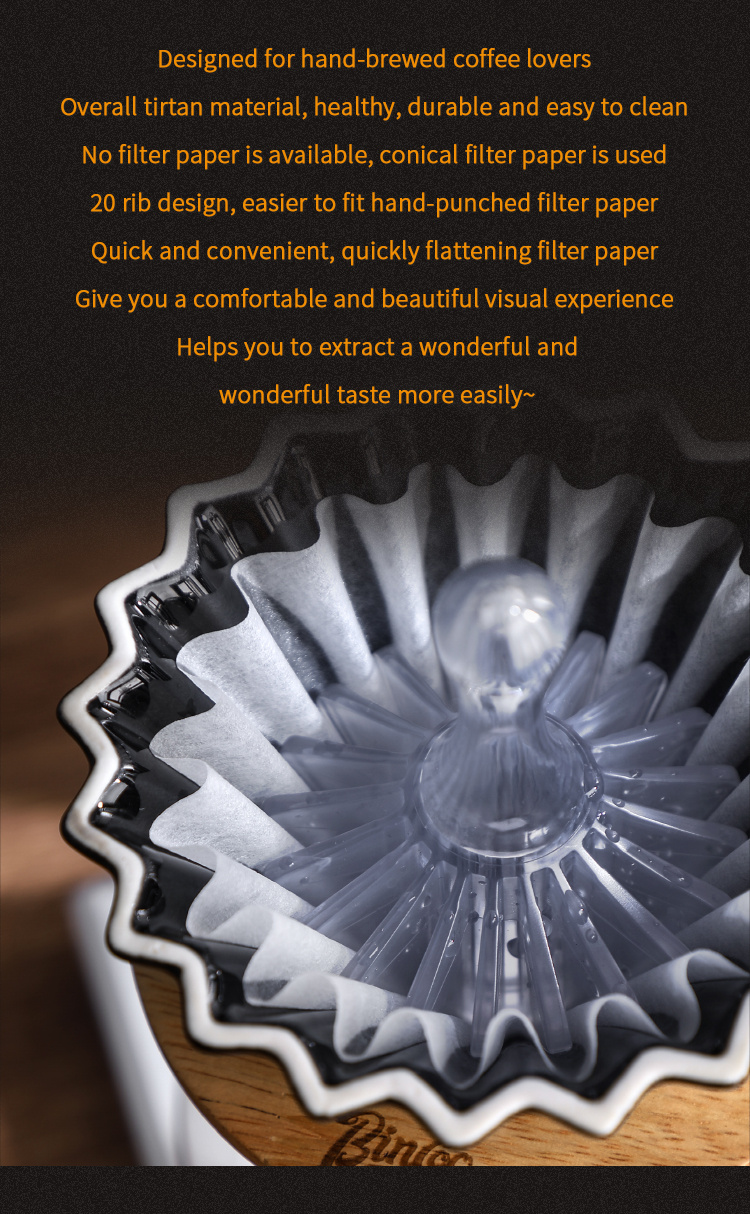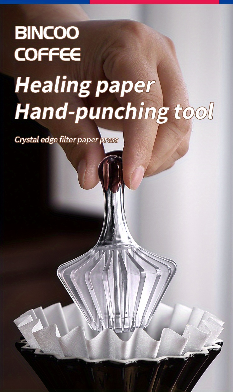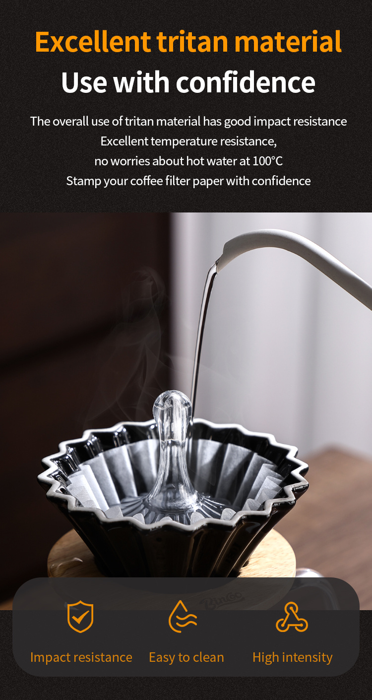 The Bincoo Coffee Paper Filter Press Tool is a durable, heat-resistant pour-over accessory designed to position and secure coffee paper filters during manual brewing. Made from Tritan BPA-free plastic, it withstands high temperatures, resists deformation, and maintains clarity and strength during repeated use. Its ergonomic structure ensures comfortable handling while offering precise filter alignment for consistent extraction.